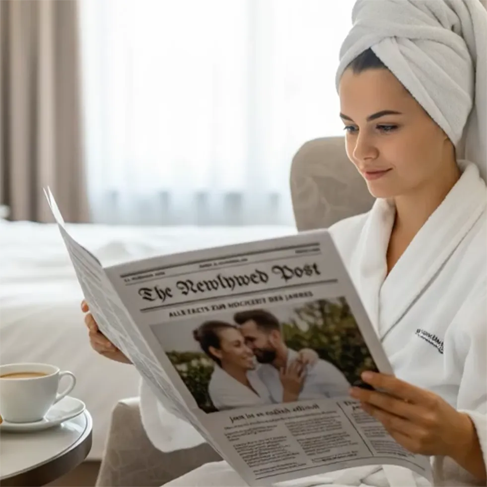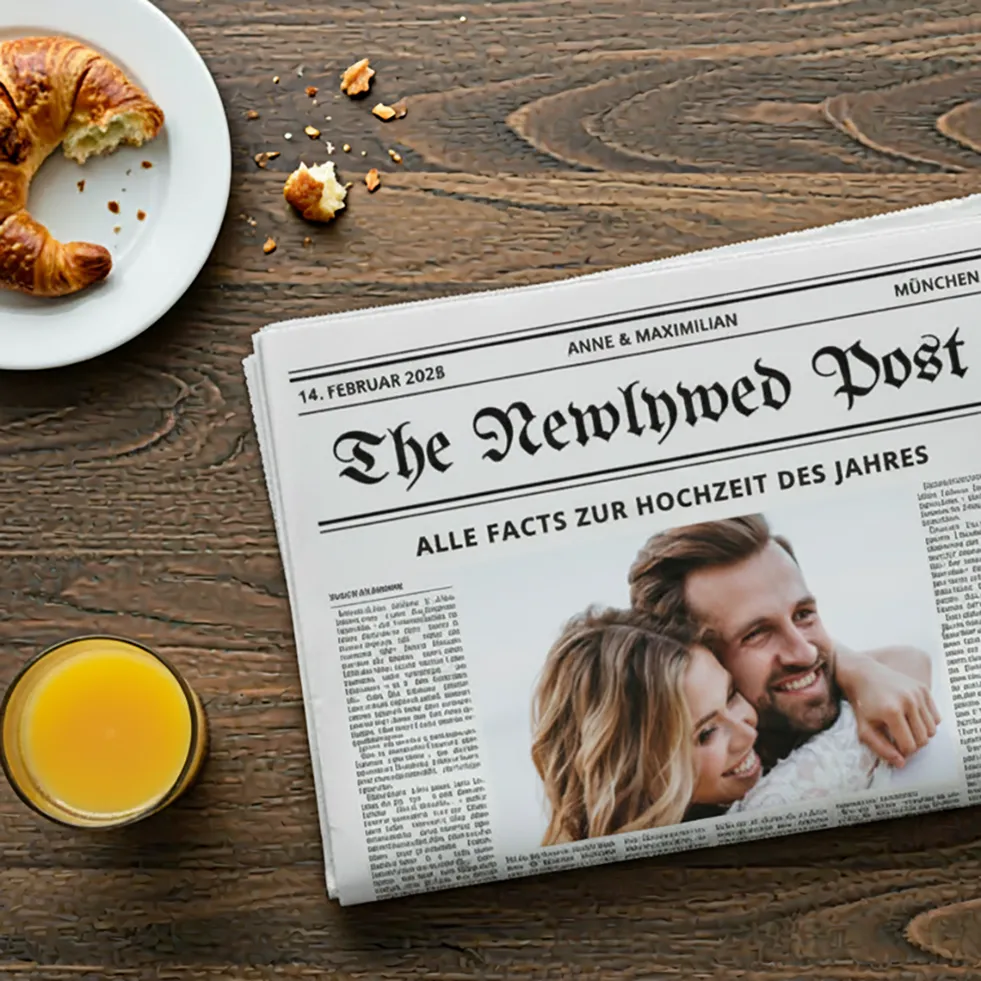Wir drucken eure Tageszeitung mit größter Sorgfalt und schicken sie zuverlässig zu euch – optional mit Express-Service – damit sie pünktlich zur Hochzeit in euren Händen liegt.