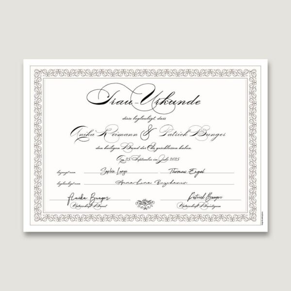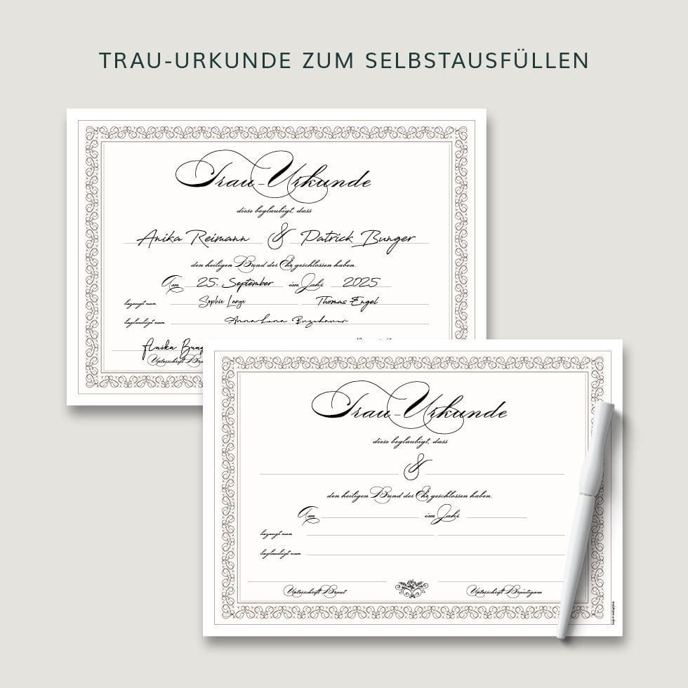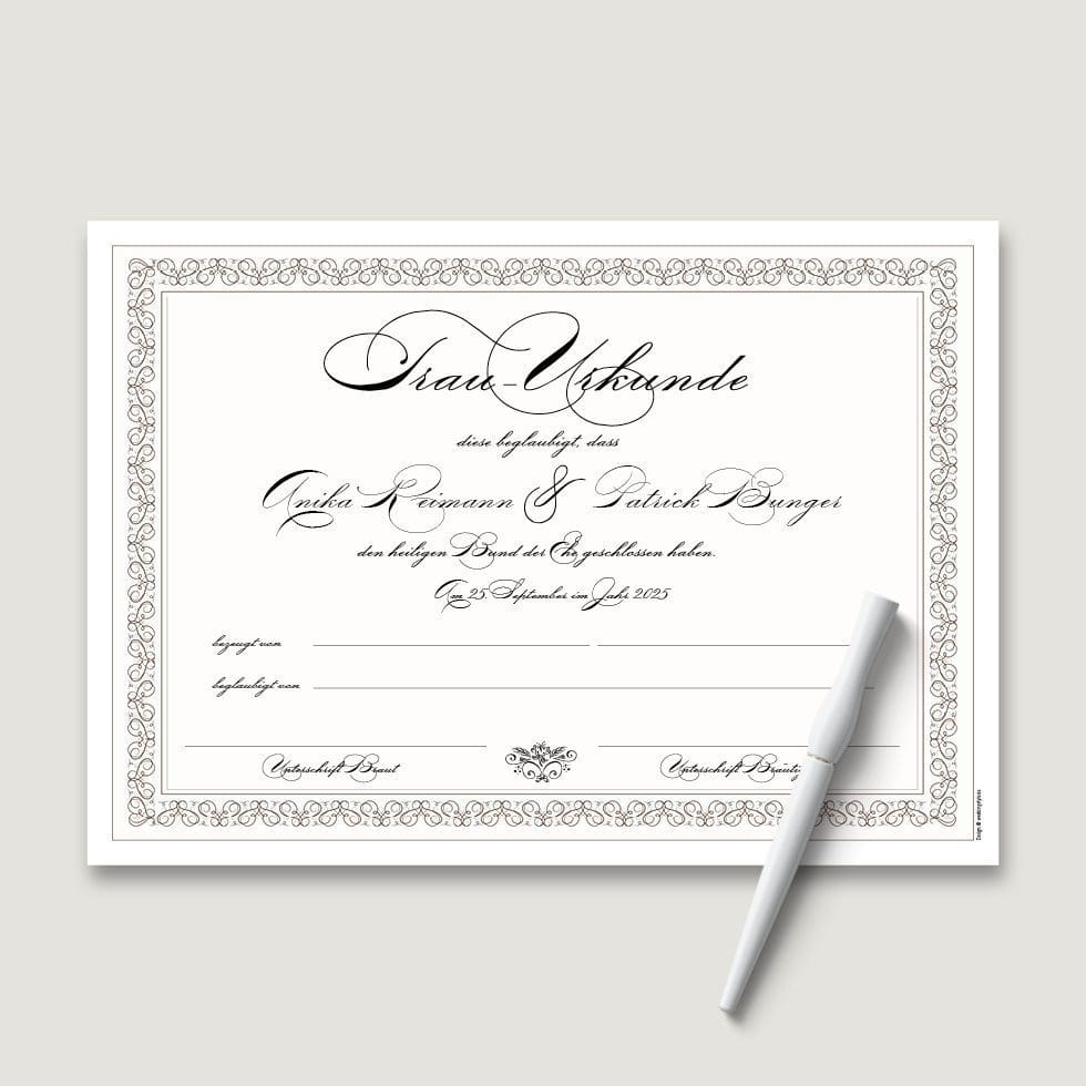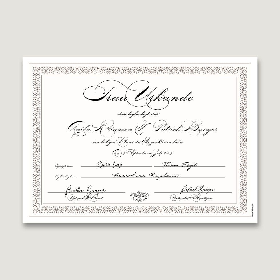 Eine Trauurkunde ist eine hübsch gestaltete, symbolische Urkunde ohne Rechtsgültigkeit, die ihr zusätzlich beim Standesamt, in der Kirche oder bei einer freien Trauung von von eurem Standesbeamten, Trauredner oder Priester sowie den Trauzeugen unterzeichnen lassen könnt.