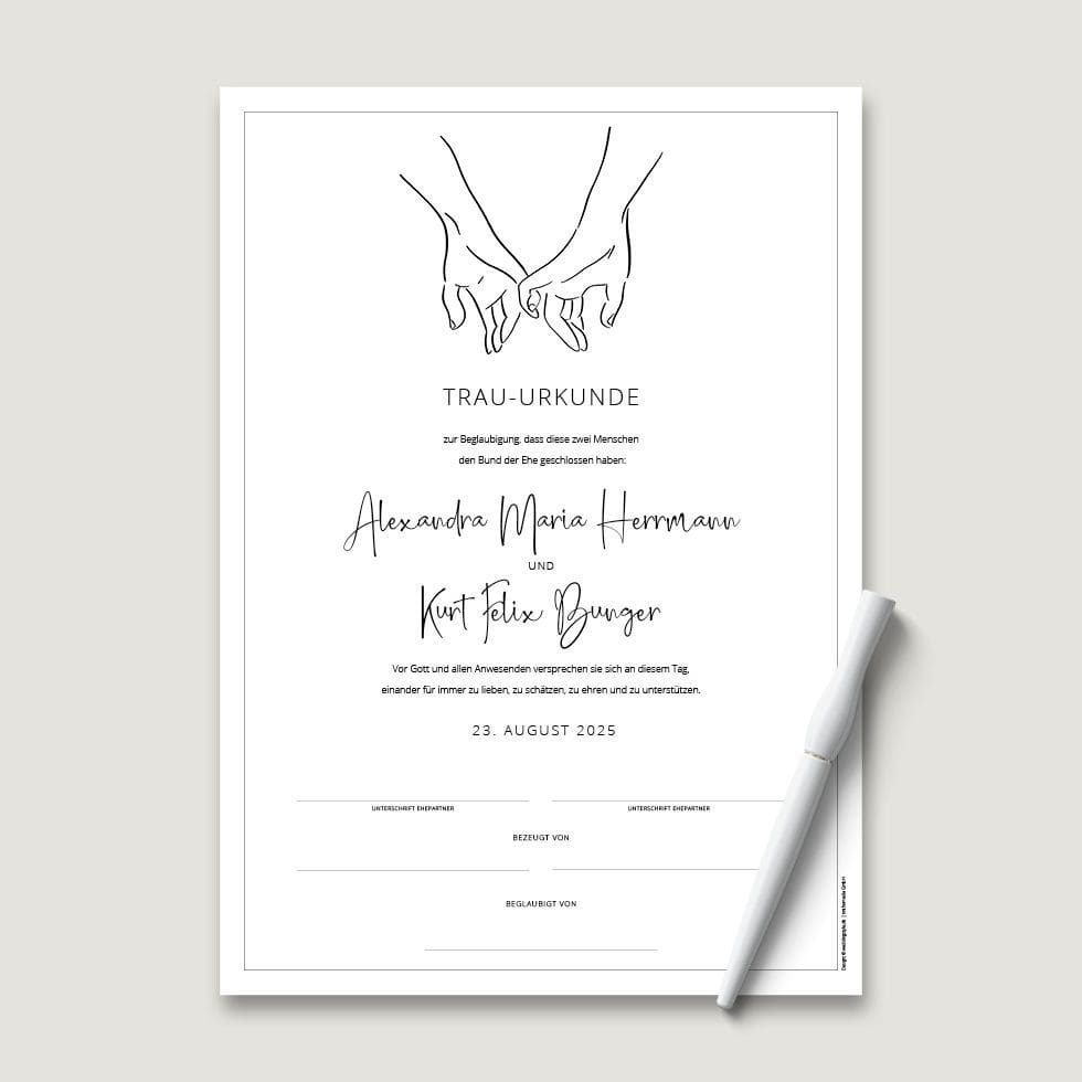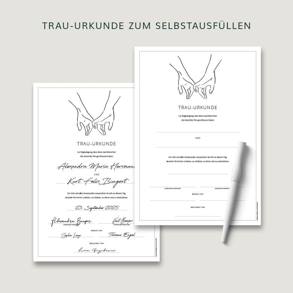 Deshalb ist das Unterzeichnen einer Hochzeitsurkunde wie ein abschließendes Trau-Ritual, das dieses Versprechen bei der standesamtlichen, kirchlichen oder freien Trauung zusätzlich besiegelt und für immer festhält.