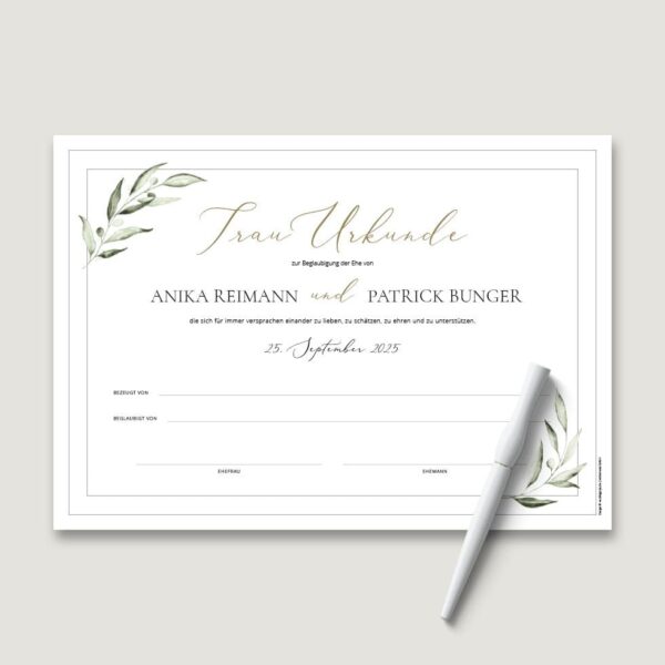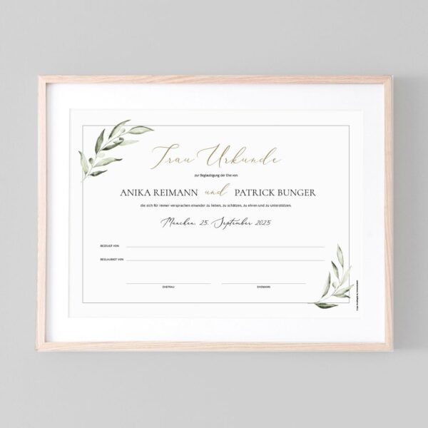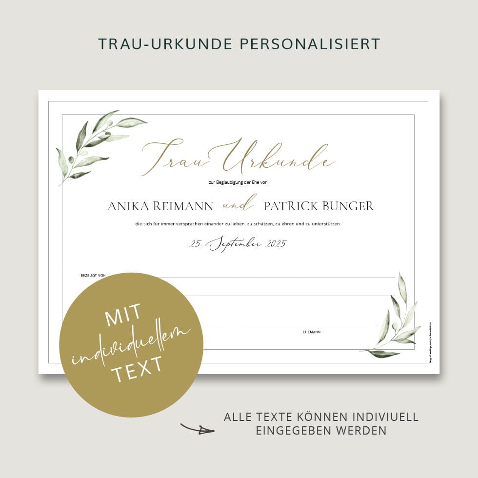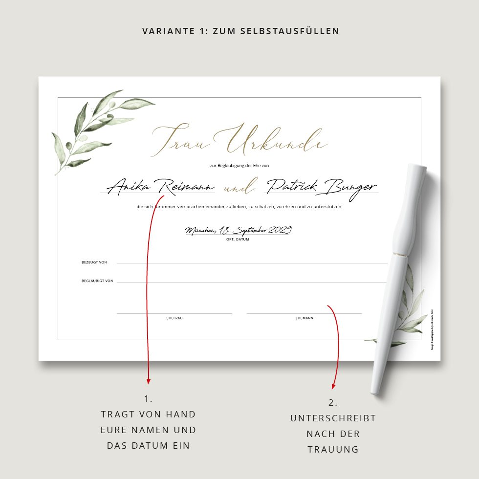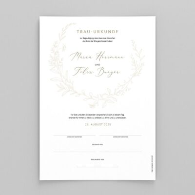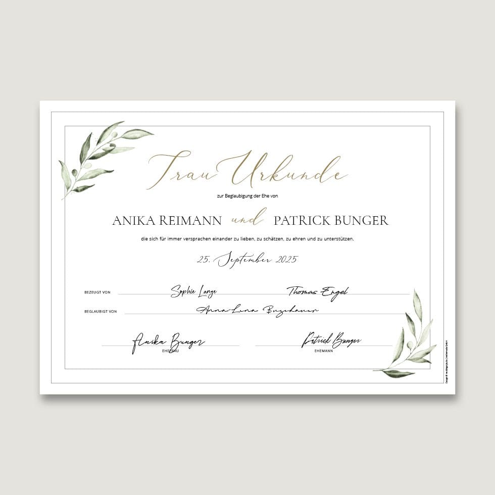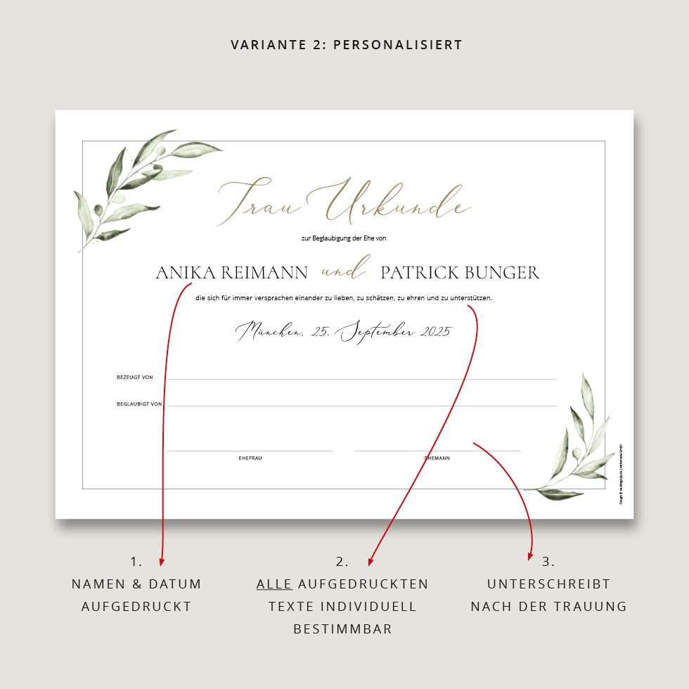 - Wir gestalten innerhalb von 1-2 Werktagen eure persönliche Trauurkunde und drucken sie auf feine Papiere.