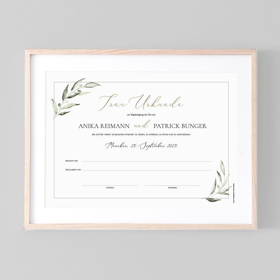 Unsere Trauurkunden sind deshalb mit viel Liebe so gestaltet, dass sie eine Erinnerung für die Ewigkeit sind, die ihr euch anschließend eingerahmt an einem Ehrenplatz aufhängen könnt.