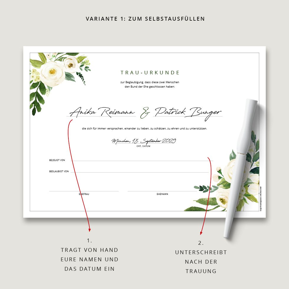 Deshalb ist das Unterzeichnen einer Hochzeitsurkunde wie ein abschließendes Trau-Ritual, das dieses Versprechen bei der standesamtlichen, kirchlichen oder freien Trauung zusätzlich besiegelt und für immer festhält.