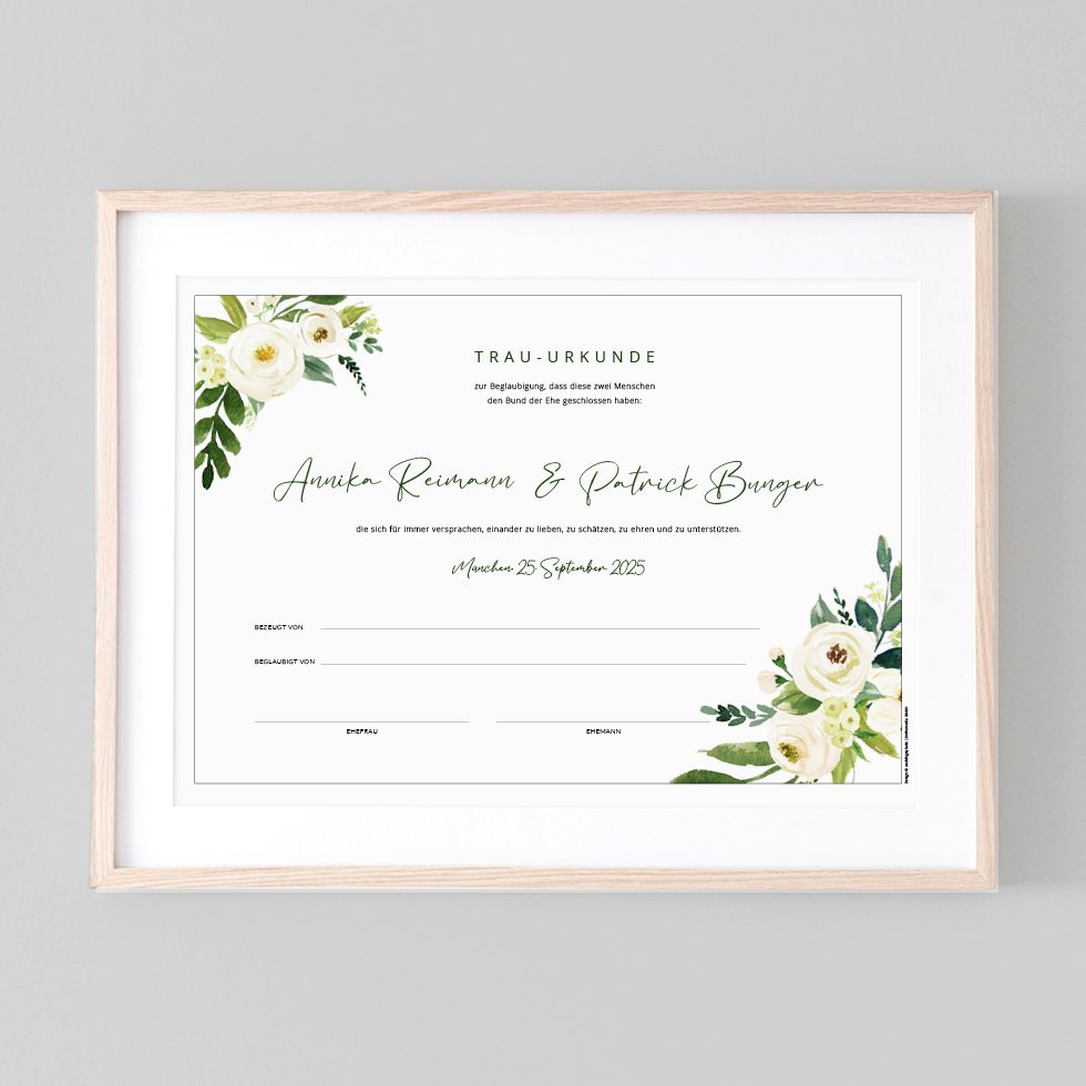 Unsere Trauurkunden sind deshalb mit viel Liebe so gestaltet, dass sie eine Erinnerung für die Ewigkeit sind, die ihr euch anschließend eingerahmt an einem Ehrenplatz aufhängen könnt.