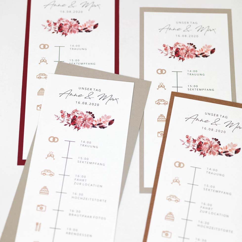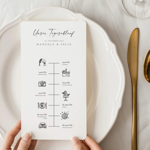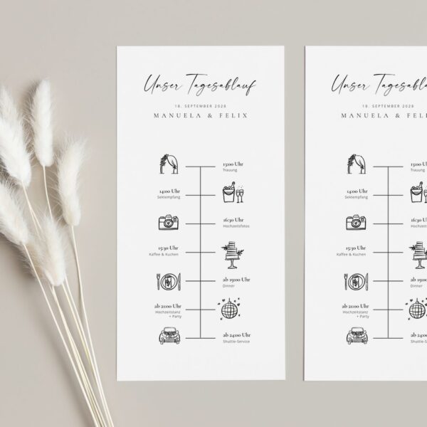 Eure persönliche Tagesablauf Karte wird bei uns individuell perfekt abgestimmt auf euer persönliches Design und das gewählte Papier gedruckt, damit ihr immer das beste Ergebnis erhaltet.