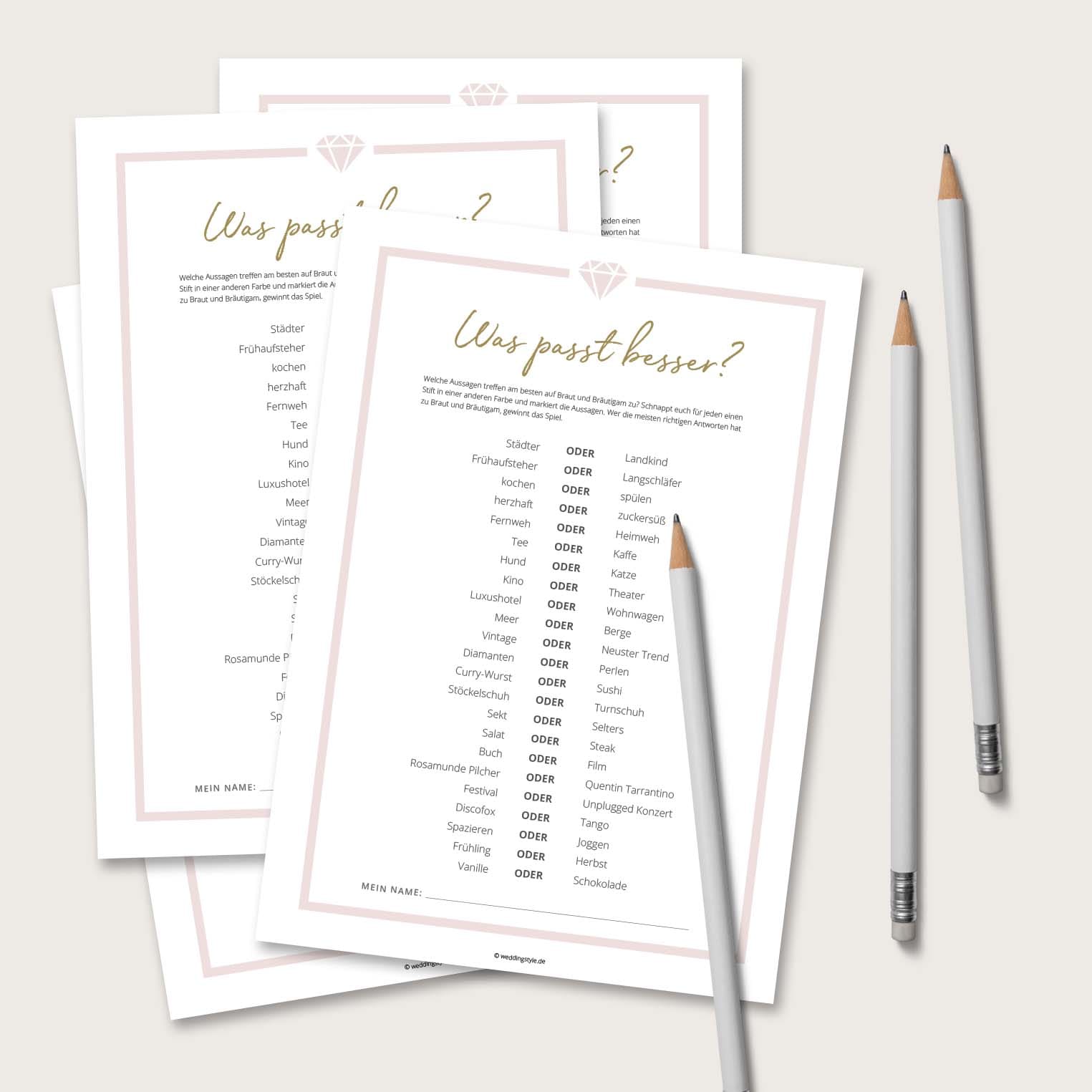 Für noch mehr Spaß könnt ihr auch die Braut und den Bräutigam ebenfalls ein Blatt für den jeweils anderen ausfüllen lassen. So wird später auch die ein oder andere witzige Diskussion entstehen.