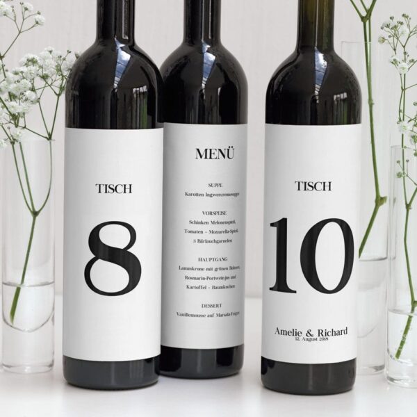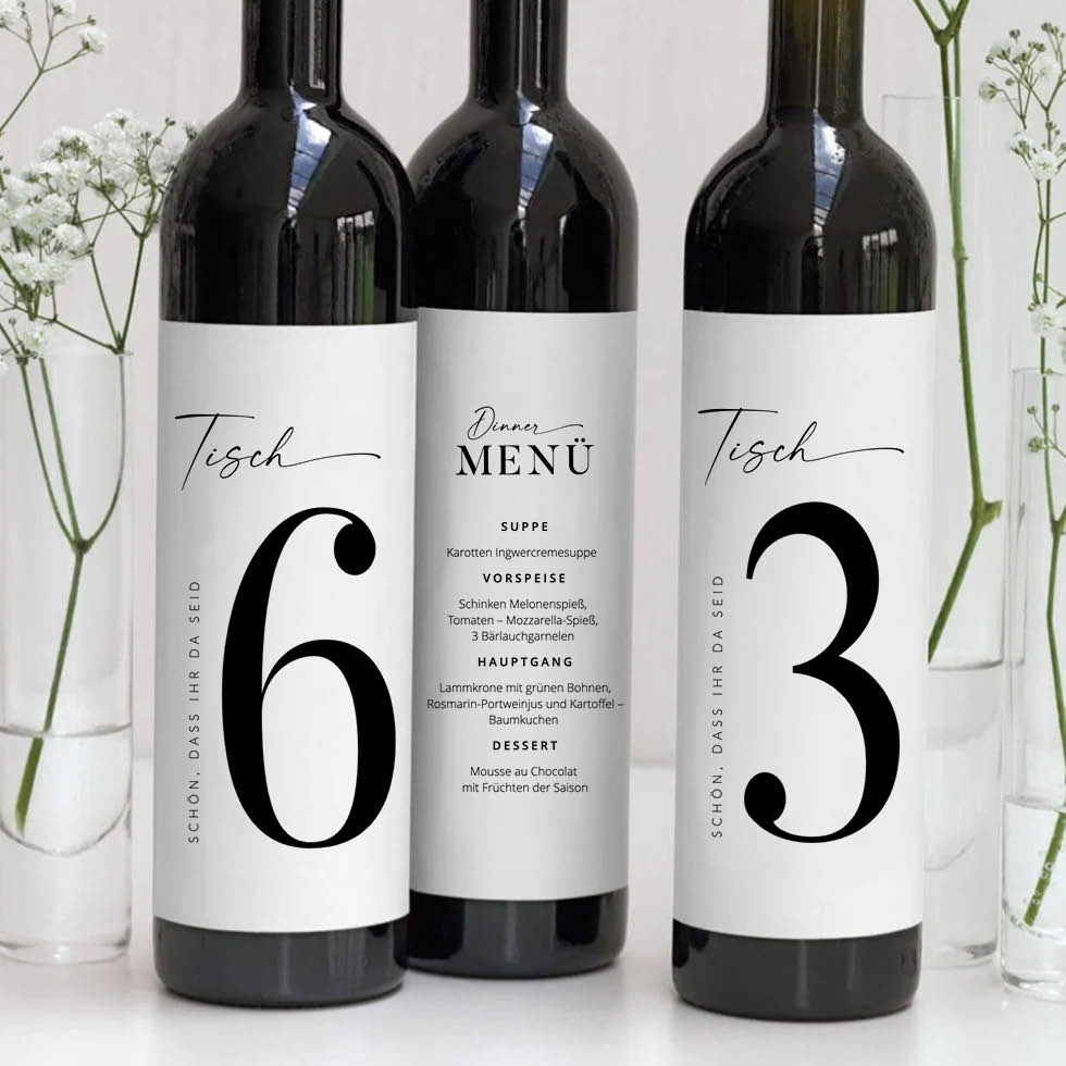 Individuelle Weinflaschenetiketten für Tischnummer & Menü gestalten
