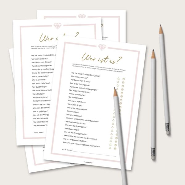 Mission: Mit den coolen personalisierbaren "Wer ist es" Fragebögen könnt ihr alle Gäste einbinden. Denn indem alle erraten, auf wen die Aussage zutrifft, kommen garantiert alle sofort ins Gespräch und stellen die witzigsten Vermutungen an.