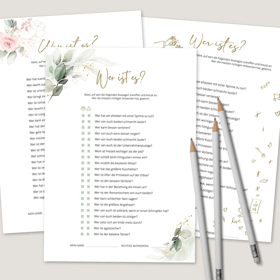 Mit den personalisierbaren "Wer ist es" Übereinstimmungsspiel Fragebögen können alle vor der Auflösung miträtseln und punkten.