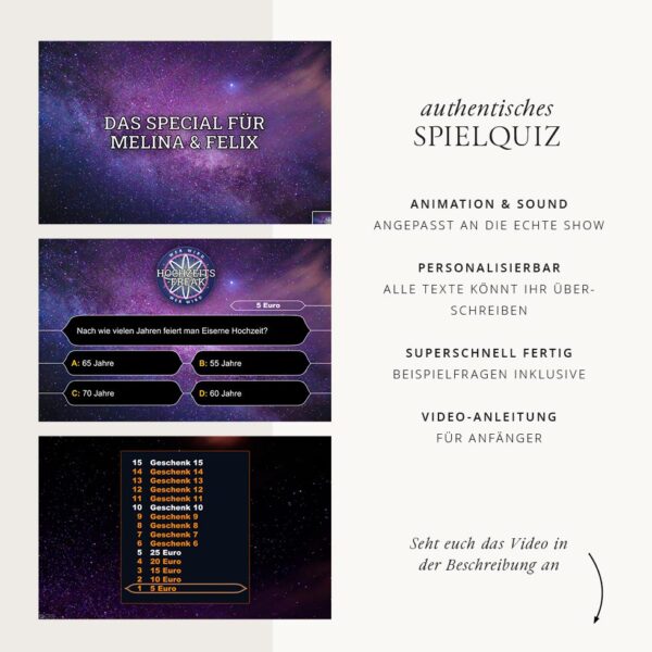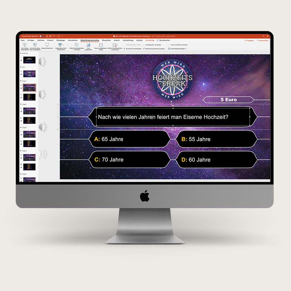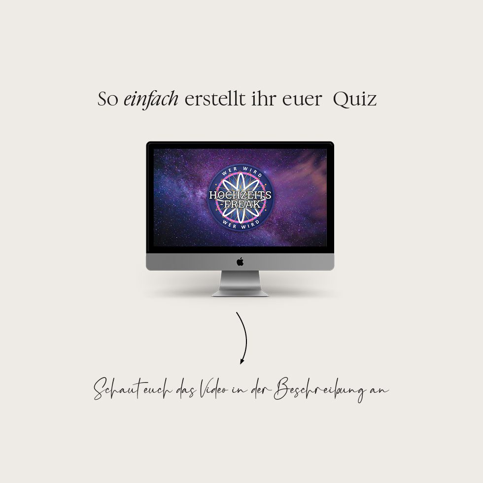 Über einen Beamer (in vielen Locations bereits vorhanden) könnt ihr mit dieser Powerpoint-Präsentation eine tolle Show gestalten – authentisch wie die echte "Wer wird Millionär?" Show im Fernsehen. Lasst alle Gäste als Kandidaten spielen oder entscheidet euch für eine Brautpaar- oder Trauzeugen-Challenge, bei der alle mitraten können. Wir haben uns für euch die verschiedensten spannenden Spieloptionen ausgedacht.