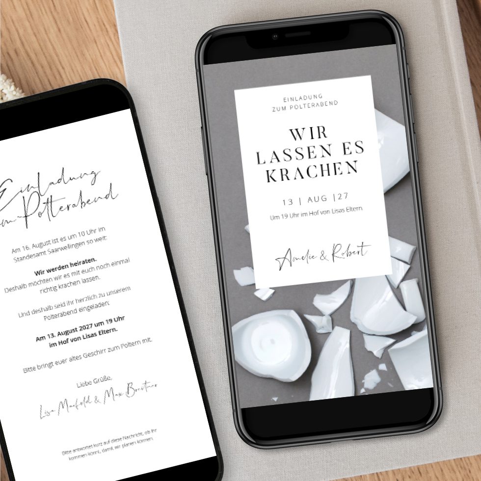 Gestaltet eure digitale Polterabend Einladung für WhatsApp oder E-Mail absolut individuell und ganz nach euren Wünschen: