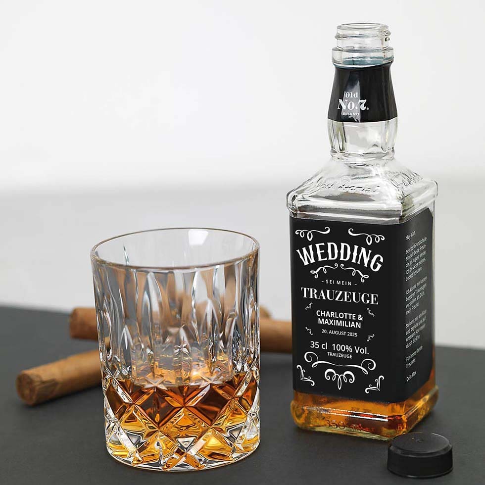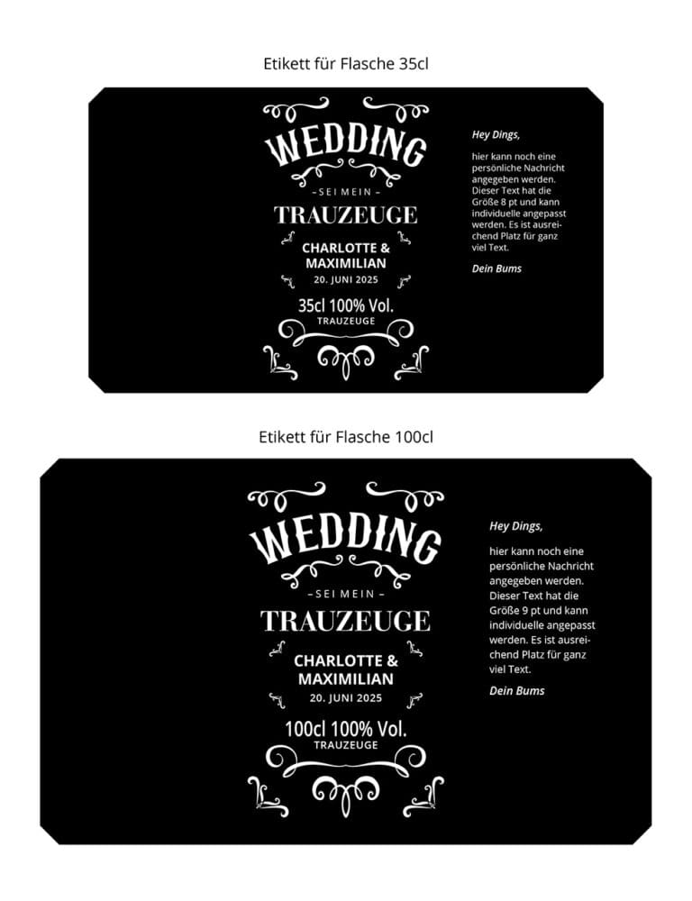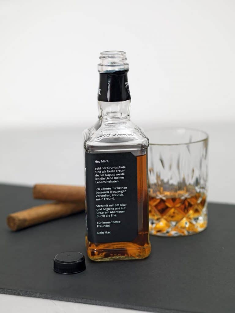 Mit diesem Flaschenetikett fragt ihr eure Trauzeugen, Groomsmen oder überreicht euren Lieben ein ganz persönliches Geschenk. Das Coole: Ihr könnt das Whiskey Flasche Etikett mit eurem eigenen, originellen Text, Spruch oder Motto beschriften.
