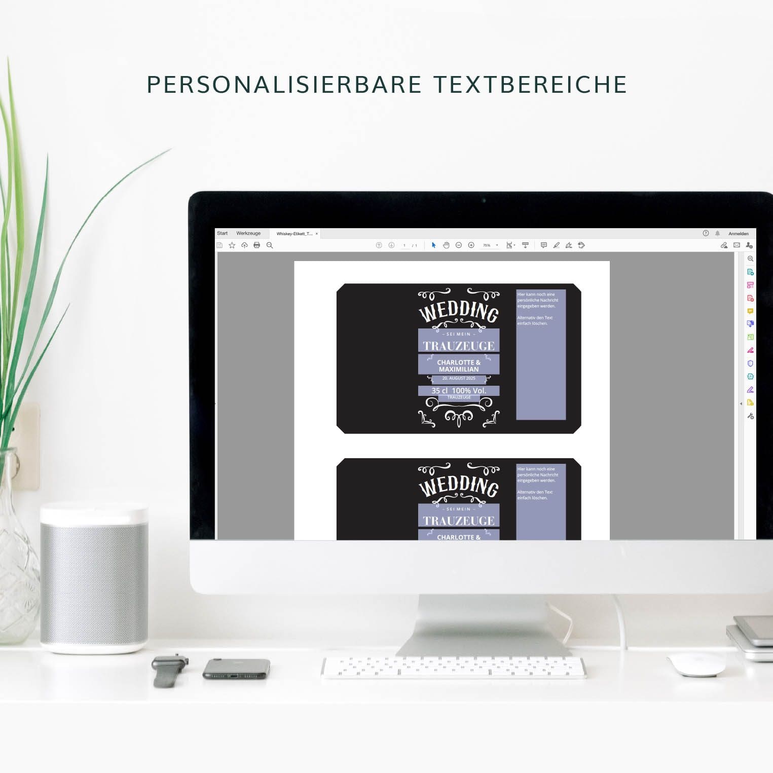 Bei der Download-Version können alle Texte personalisiert werden – außer die Headline Wedding, Cheers oder Jack Daniels.