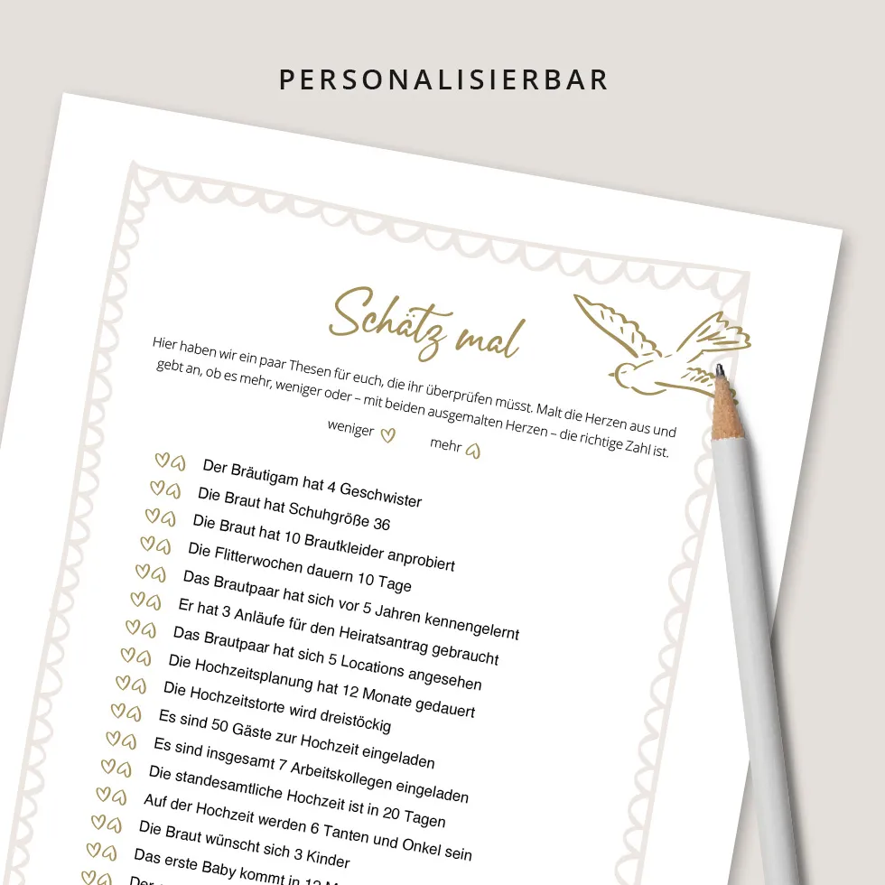 - Schätz mal (personalisierbar) – 21 Schätzfragen halten alle Gäste auf Trab – knifflig auch wenn alle die beiden länger kennen.