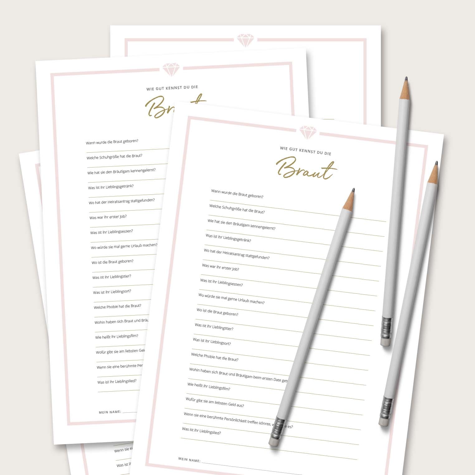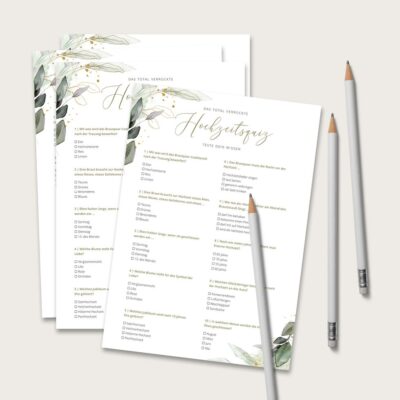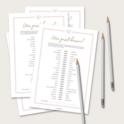 - PDF-Spielebögen mit ultimativen sowie universellen Fragen über die Braut und den Bräutigam