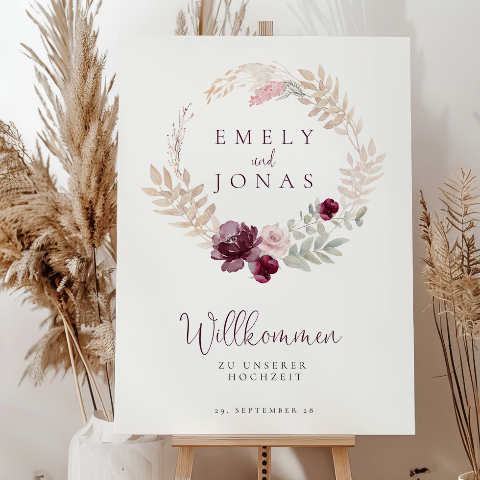 Gestaltet euer individuelles Willkommensschild zur Hochzeit ganz nach euren Wünschen und erhaltet es als PDF Vorlage, Poster, stabile Platte, Leinwand, auf Acryl, oder als gerahmtes Bild.