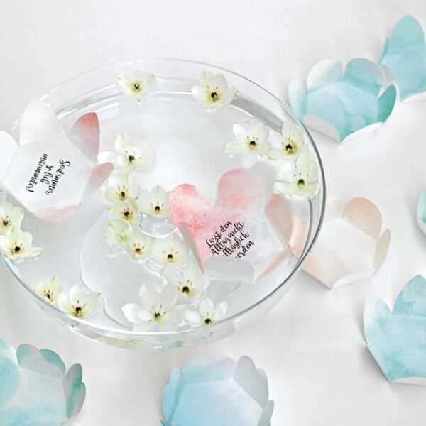 Besonders schön ist es, die Blüten in einem verschlossenen Umschlag mit Aufblüh-Anleitung zu überreichen. Zuhause werden die Gäste dann von eurer Nachricht überrascht, wenn sie ihr Gastgeschenk auspacken.