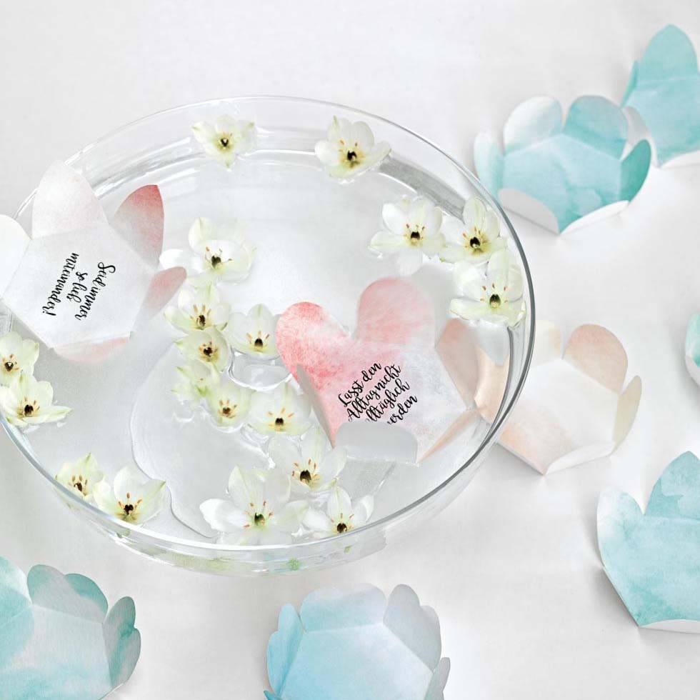 Wollt ihr euren Gästen eine zauberhafte Überraschung als Dankeschön zusenden? Dann ergänzt im Briefumschlag eine oder mehrere Wunschblüten mit hübscher Aufblüh-Anleitungs-Karte.