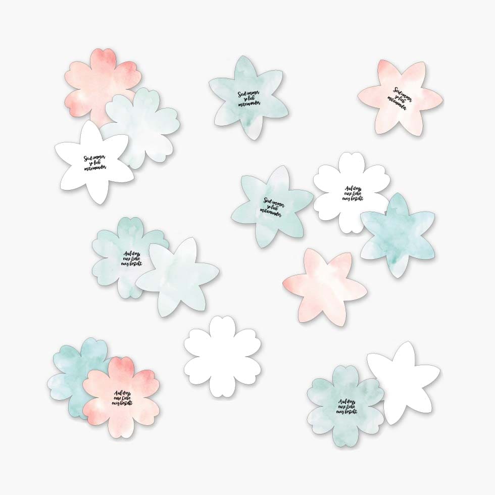 Alle Blüten sind in den Farben Peach, Türkis, Mint und Weiß enthalten.