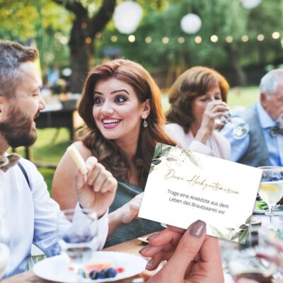 Lasst eure Gäste statt ins Gästebuch ihre Wünsche und gemeinsame Erinnerungen mit euch auf eine Wunschblüte schreiben. Als Anregung könnt ihr sie auch (→ wie in diesem Gästebuch-Beispiel gezeigt) zu verschiedenen, vorgegebenen Kategorien etwas schreiben lassen. Dann ist es für sie sogar noch viel einfacher.