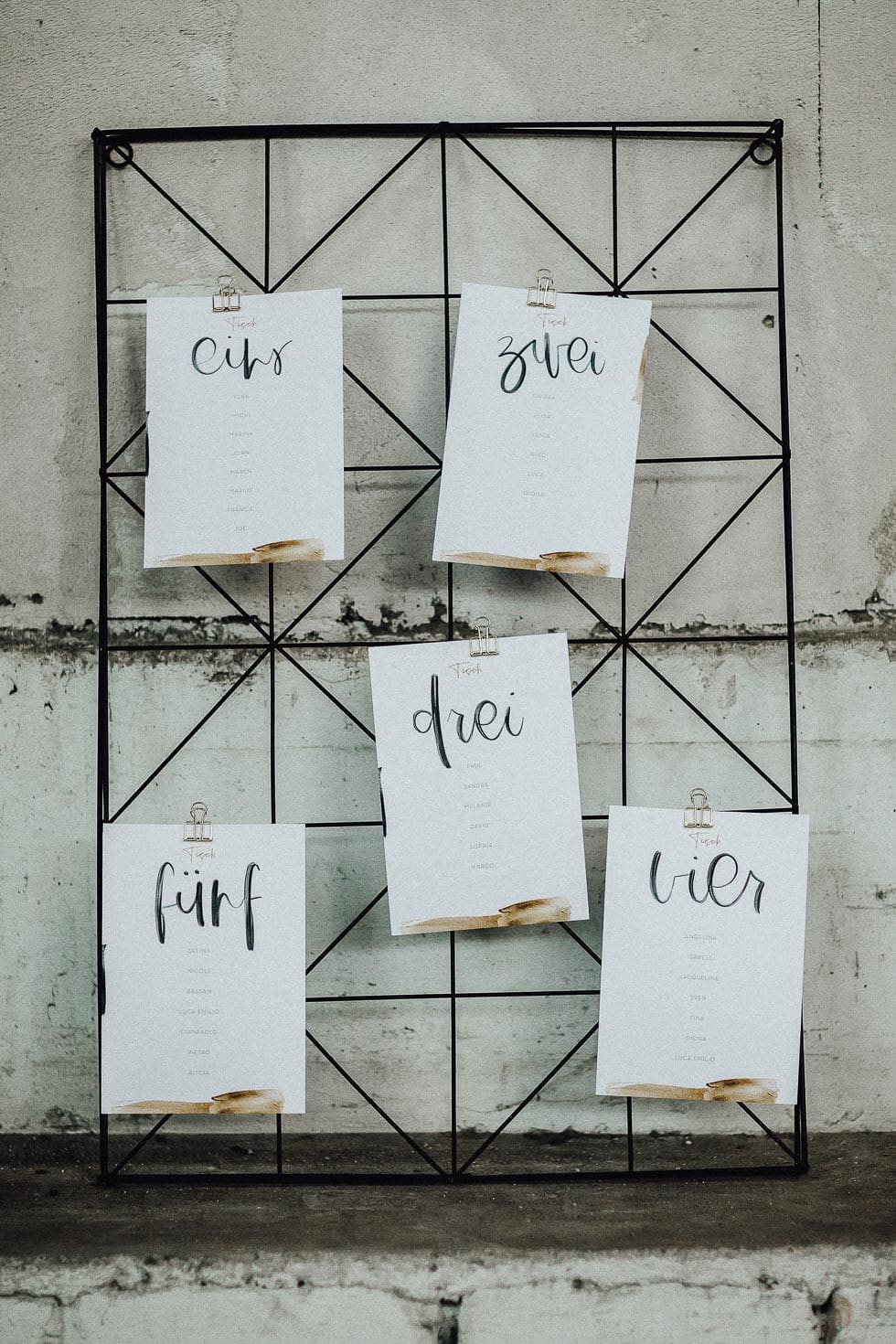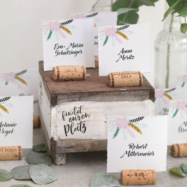 Jetzt wird es richtig besonders: Mit einzelnen Namenskarten könnt ihr einen Sitzplan mit echtem Wow-Effekt gestalten. Eure Gäste fühlen sich sofort willkommen, weil jede Person ein eigenes Kärtchen findet – und gleichzeitig wird der Sitzplan zum dekorativen Highlight im Raum.