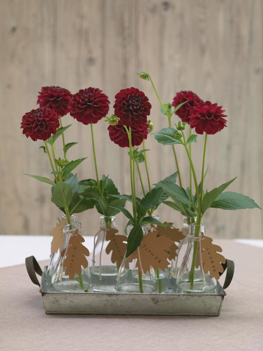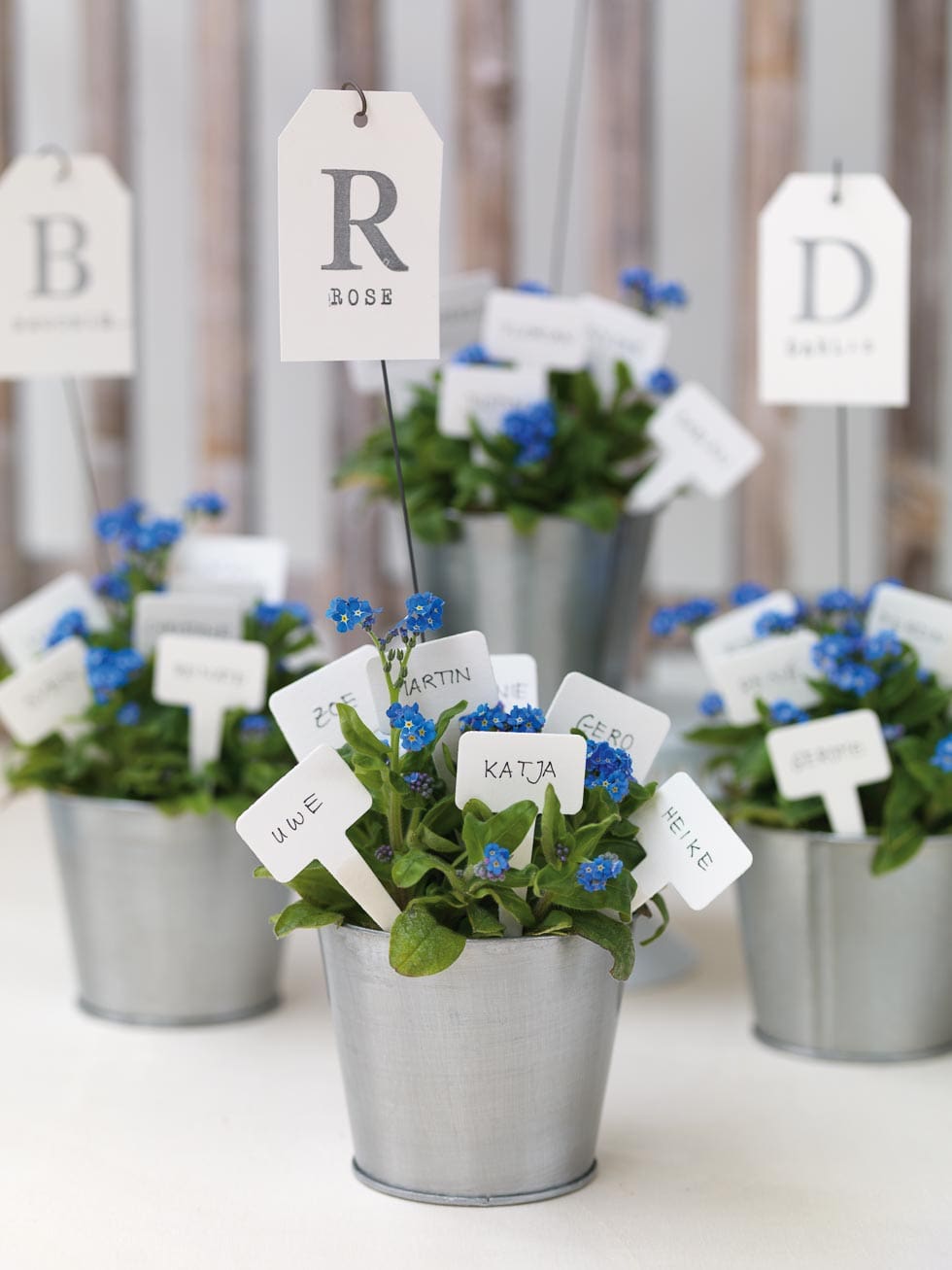 Ob in einzelnen Blumentöpfen oder in Blumen, die ihr in einer Obst- oder Weinkiste platziert – Steckt einzelne Namenskarten mit Schaschlik-Spießen hinein oder verwendet Blumen-Stecker.