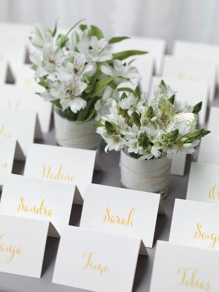 3 | Tischkarten zwischen Blumen-Arrangements gesteckt
