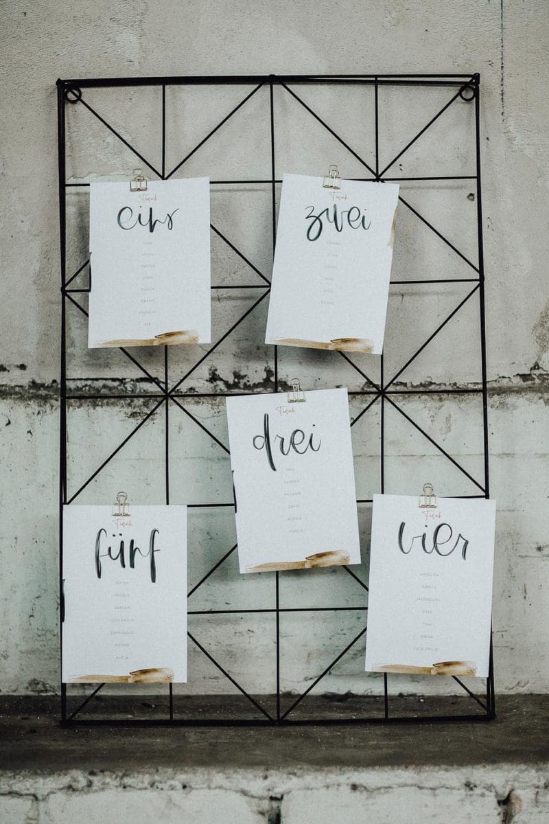 Maritim, Boho, Vintage, City-Chic – übertragt euer Motto auf die Tischbezeichnungen (z. B. Strand, Muschel, Düne …). So wirkt der Sitzplan wie „aus einem Guss“.