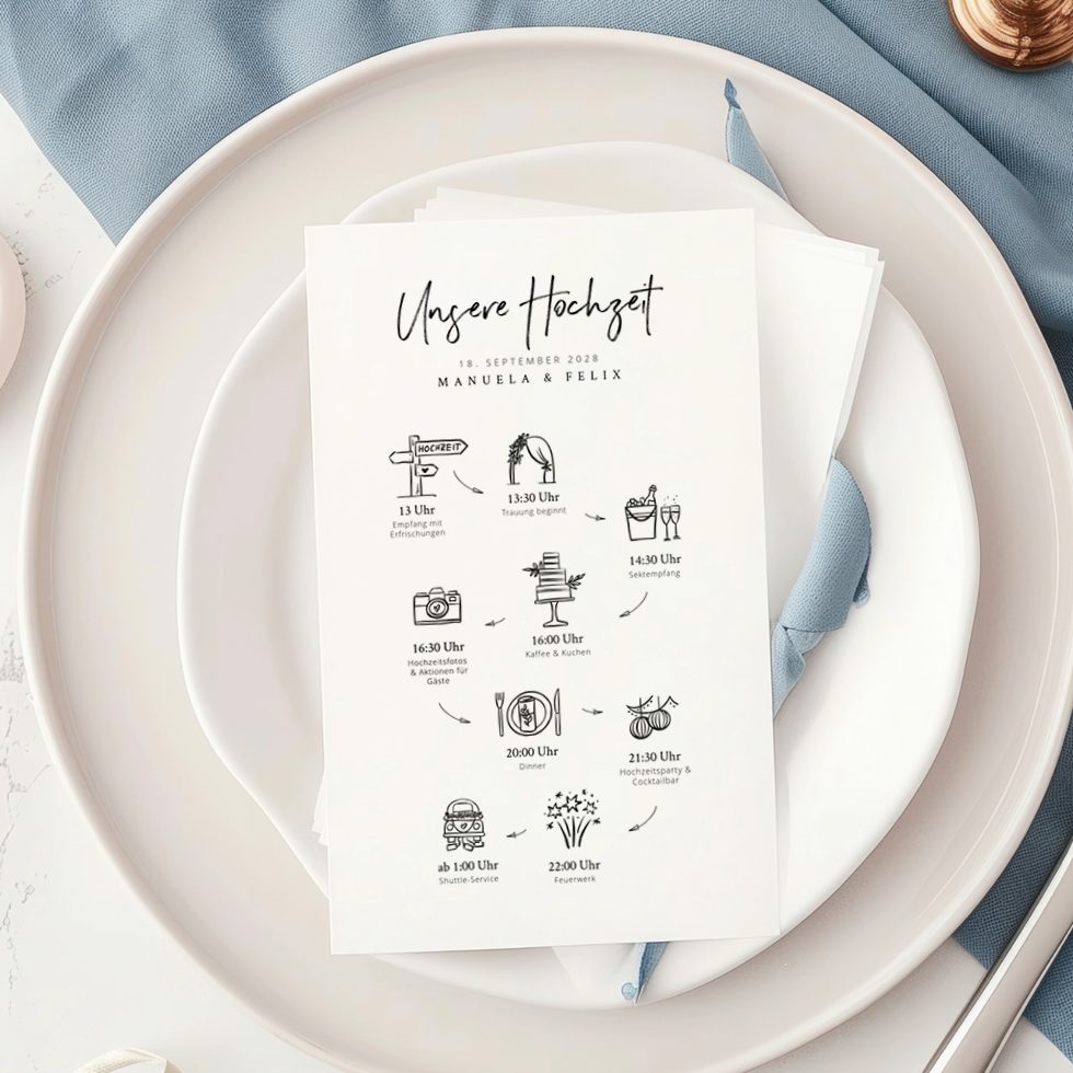 Eine charmante Grafik, die euren Hochzeitsablauf visuell festhält – ideal als hübscher Tagesplan für eure Gäste, das damit gleichzeitig zum stilvollen Deko-Element wird.