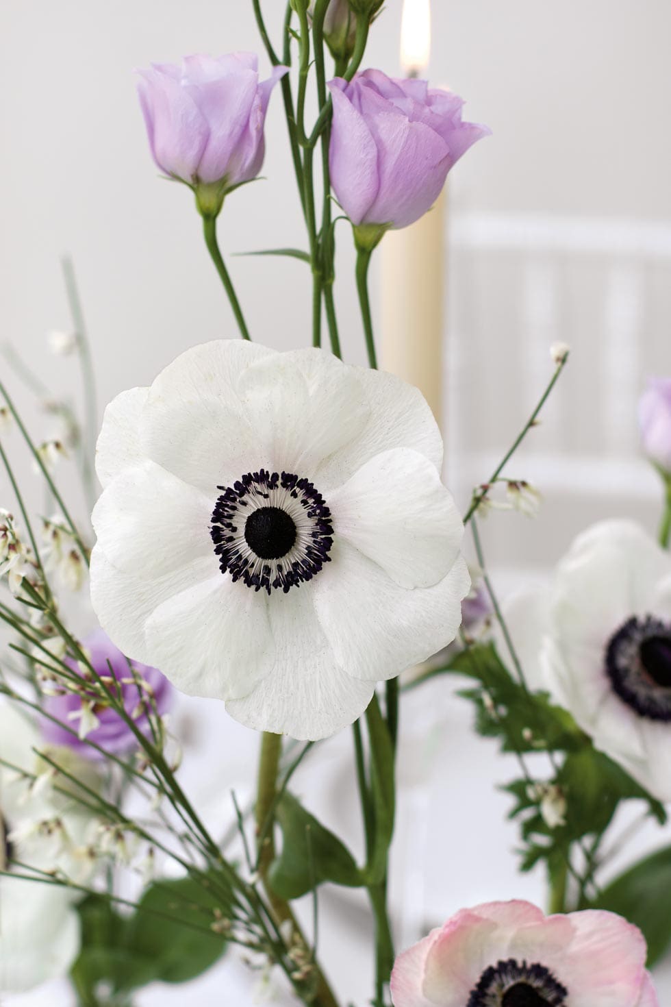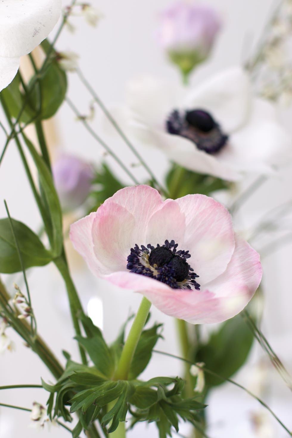Wir haben in diesem Beispiel Pfingstrosen, Bischofskraut und Agapanthus verwendet. Toll sind aber auch Levkojen, Freesien, Bouvardien, Englische Rosen oder Dahlien als Einzelkünstler dieser Tischdeko.