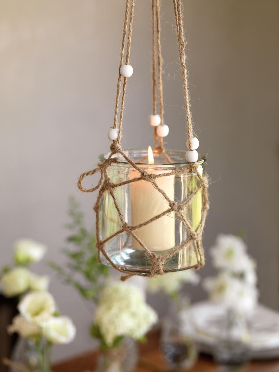 Wählt eine zur Blütenfarbe passende Kerzenfarbe. Beachtet dabei, dass die Farbe den Stil der Deko immens beeinflusst. Deshalb ist es oft schöner, Eierschale oder Beige anstelle von hartem Weiß zu verwenden.
