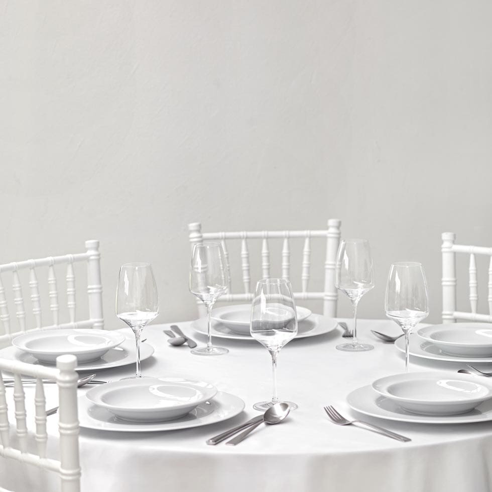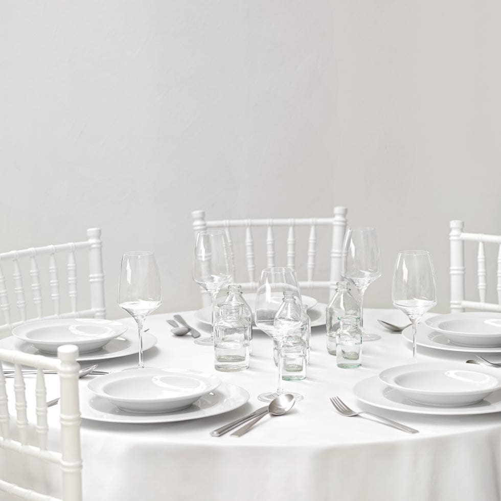So oder ähnlich wird der eingedeckte Tisch in der Location aussehen: Weiße Tischdecke, Standard-Besteck des Hauses und passende Gläser zum Menü. Schön ist es übrigens, wenn auch bereits ein Teller eingedeckt wird.