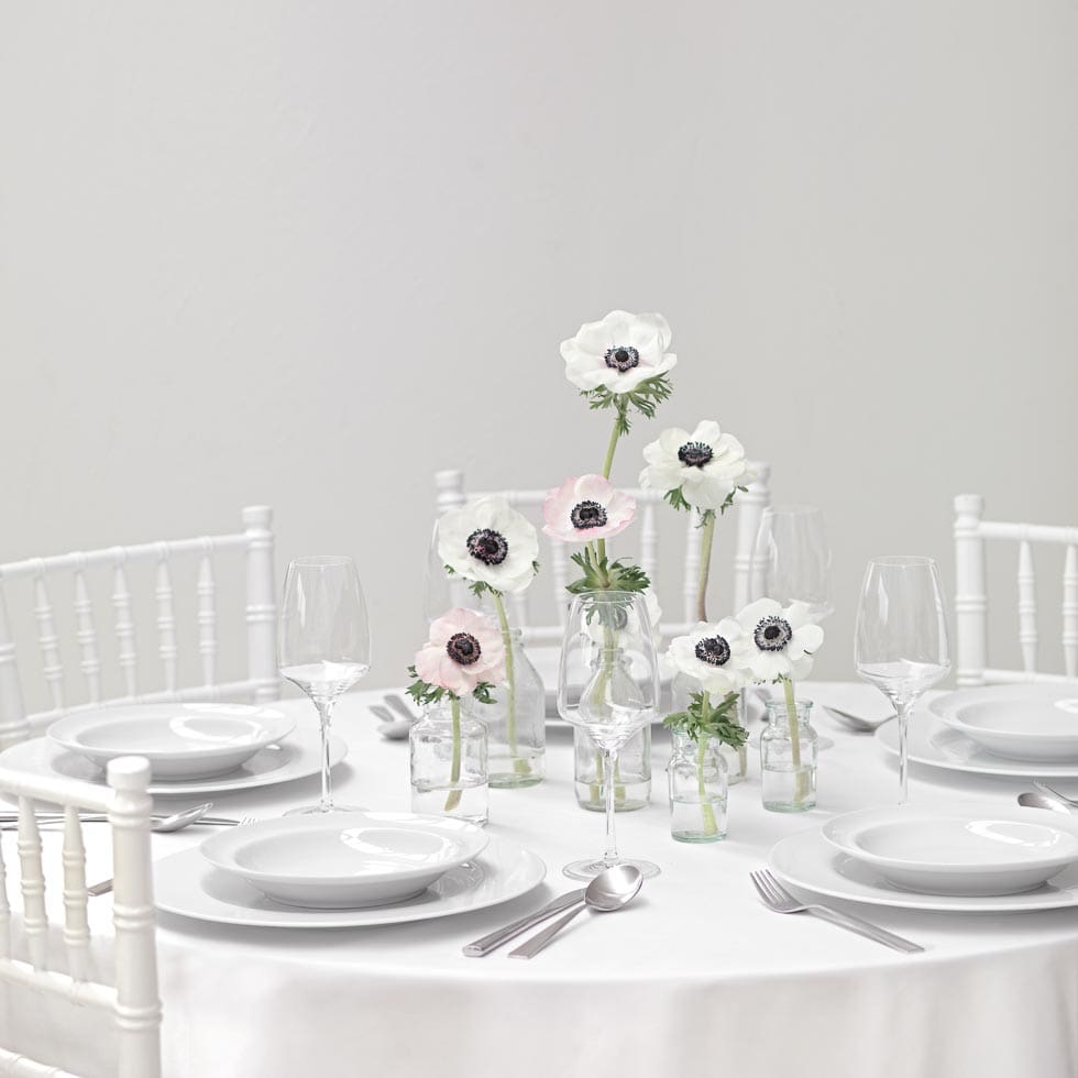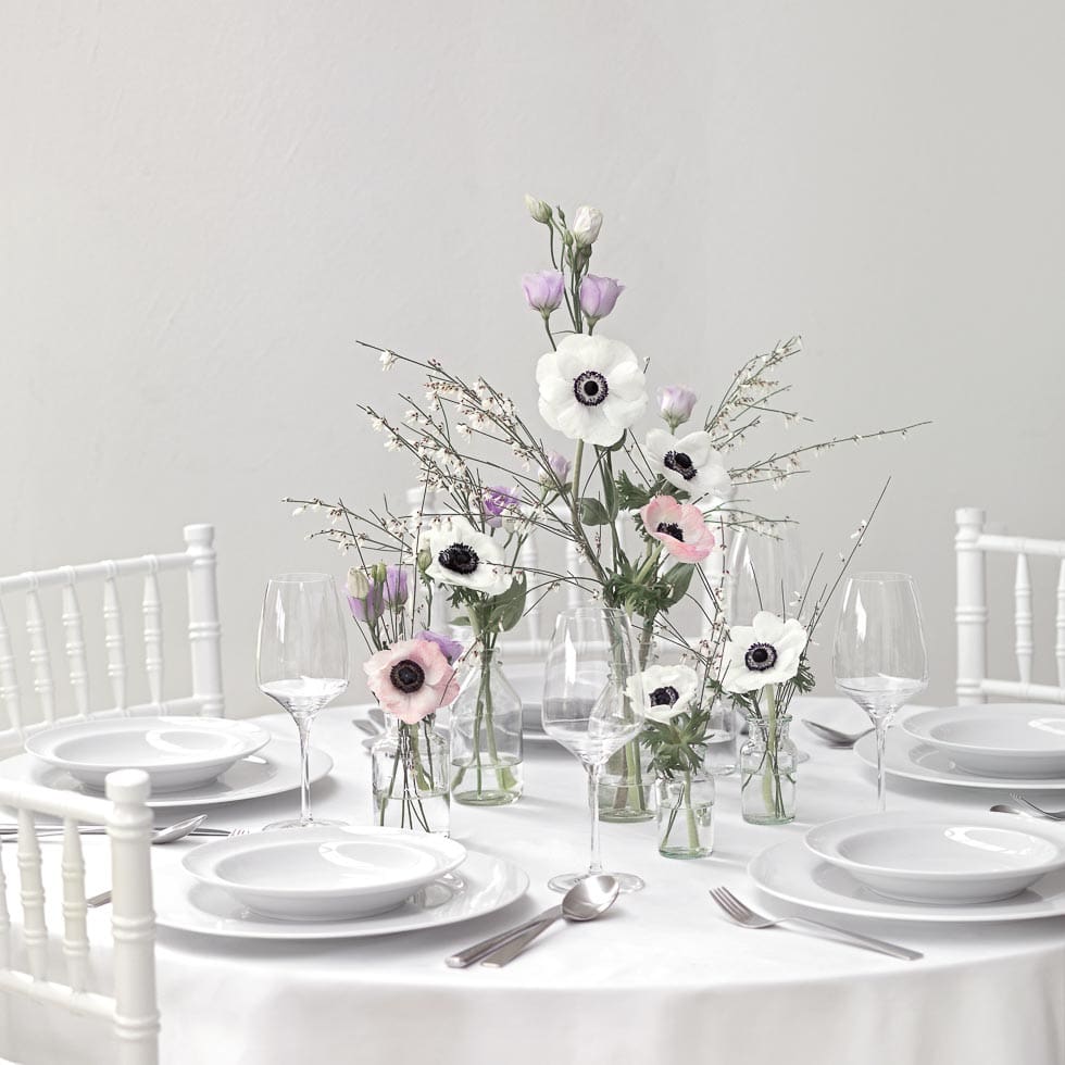 Egal, ob runder Tisch oder lange Tafel – beginnt damit, die großen Vasen auf den Tisch zu stellen. Anschließend ergänzt ihr kleinere Elemente. So seht ihr, wie viele Flaschen für die Tischgröße benötigt werden.