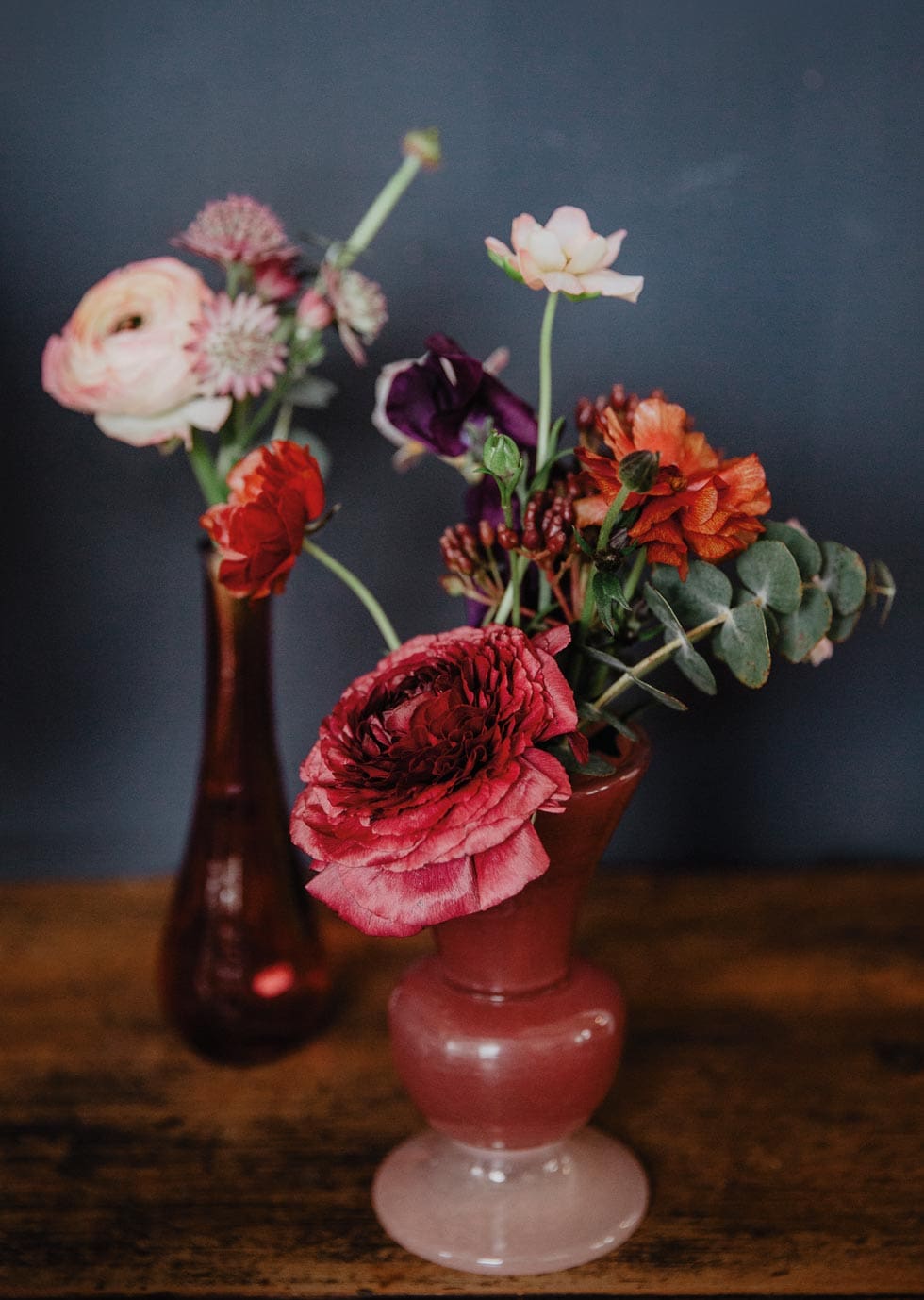Kleine Gestecke und Sträußchen in verschiedenen Vasen, die zu einem Gesamtarrangement auf dem Tisch dekoriert werden, ergeben einen liebevollen Boho Stil mit einem Hauch von Vintage.