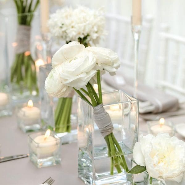 Die locker gesteckten Blumenarrangements wirken wie kleine verwunschene Gärten und spiegeln den luftig-leichten Charme der Location perfekt wider.