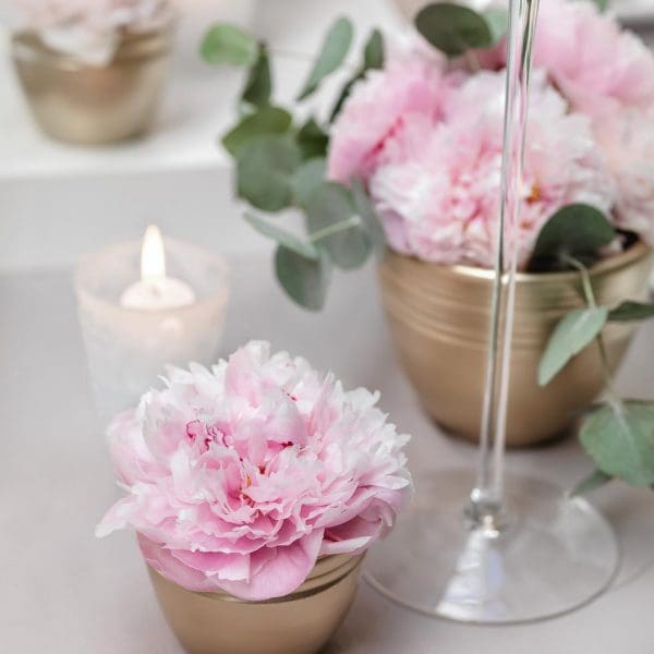 Das Geniale an dieser Deko ist, dass ihr nur wenige Blüten benötigt und trotzdem eine Deko erhaltet, die liebevoll und eindrucksvoll wirkt. Denn der Trick ist, den einzelnen kleinen Blütenarrangements durch Podeste einen großen Auftritt zu schenken.