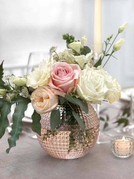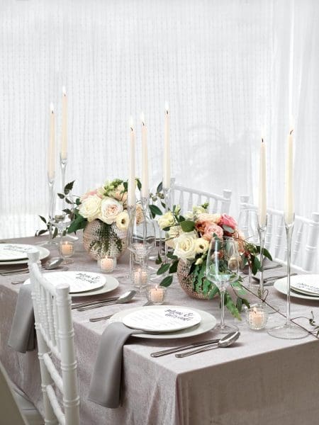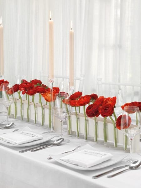 Reduziert die Deko auf ein zentrales, lineares Arrangement und kleine Details am Platz. Oft ist es auch besser, eine Tischdeko mit Stange in Erwägung zu ziehen, damit die Gäste genügend Platz auf dem Tisch haben.