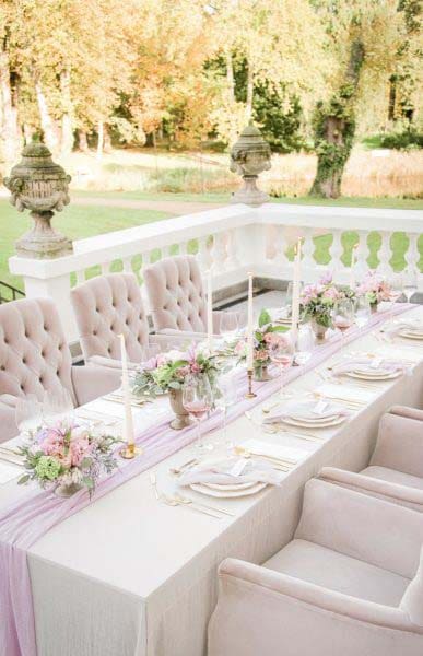 - Textilien mit Wirkung: Gestaltet die Mitte des Tisches interessanter mit einem Tischläufer aus Musselin, Spitze oder Leinen – gern auch farbig. Damit ergänzt ihr eine tolle Basis für die Deko-Bühne und könnt weniger Elemente dekorieren.