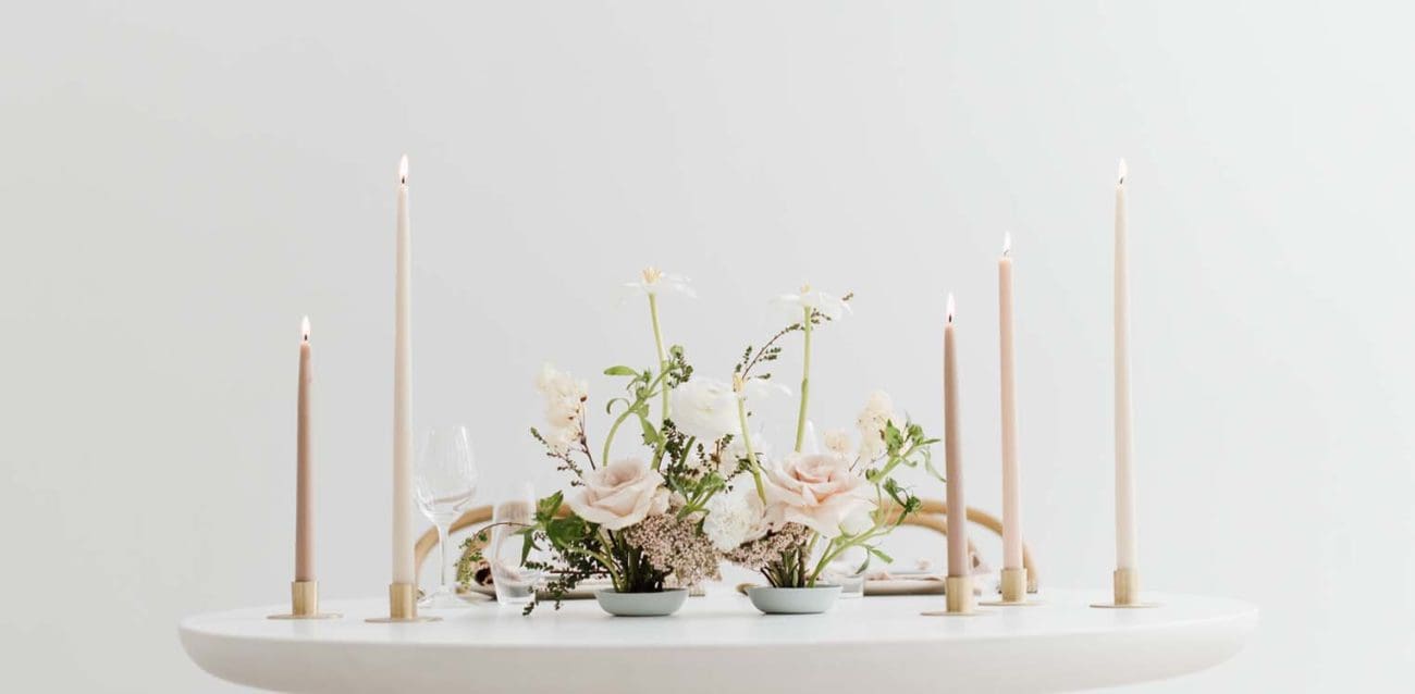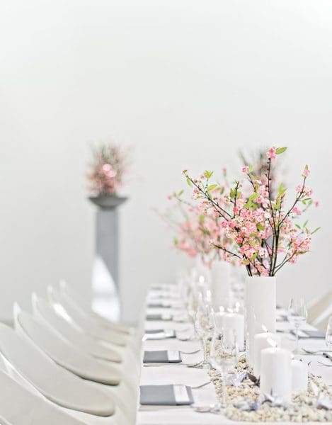 Beispiel: Schlichte weiße Tischdecken, geometrische Vasen mit Callas oder Orchideen, schwarze Kerzenständer und reduzierte Papeterie mit klarer Typografie setzen starke Akzente ohne Schnörkel.