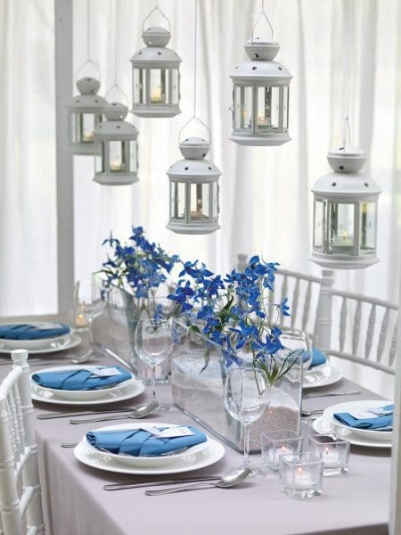 Beispiel: Weiß-blaues Porzellan, Lavendel, Olivenzweige und Leinentischdecken bringen Urlaubsgefühle auf den Tisch. Kleine Zitronen, Terrakotta-Töpfe und geflochtene Untersetzer runden das Flair ab.