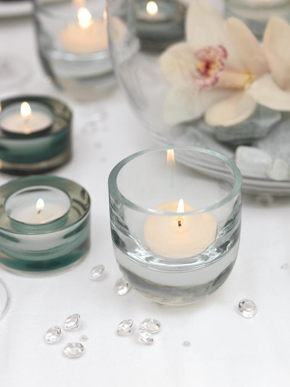 Auf der Wasseroberfläche lasst ihr eine oder mehrere Schwimmkerzen* schwimmen und ergänzt auf dem Tisch noch ein paar Teelichter in Votivkerzenhaltern.