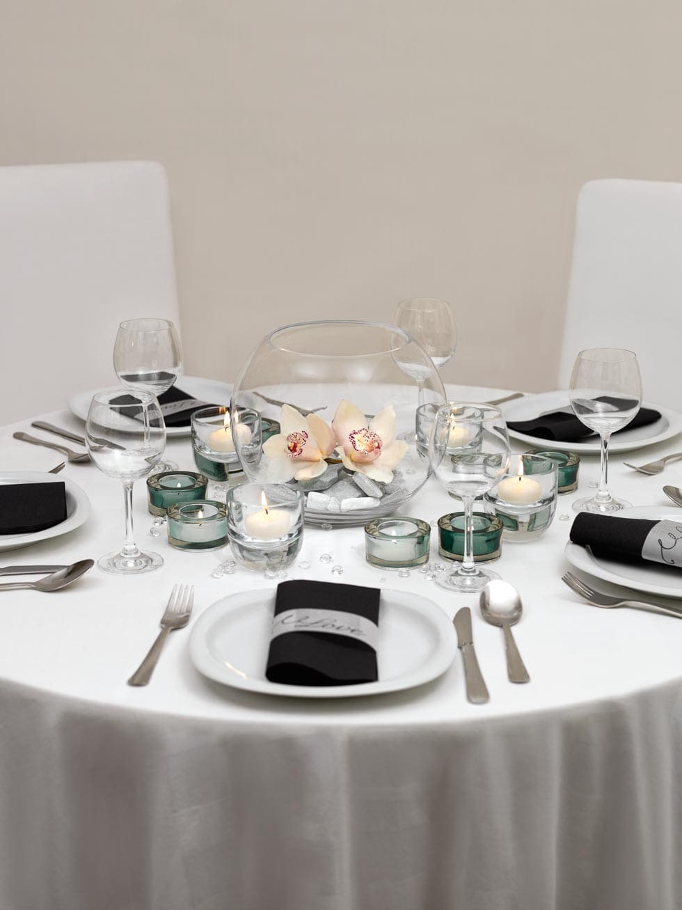 Schön ist auch, weine runde Spiegelplatte* als Basis im Zentrum des Tisches zu platzieren und darauf kleine Orchideen in einem weißen Glas-Übertopf zu ergänzen.