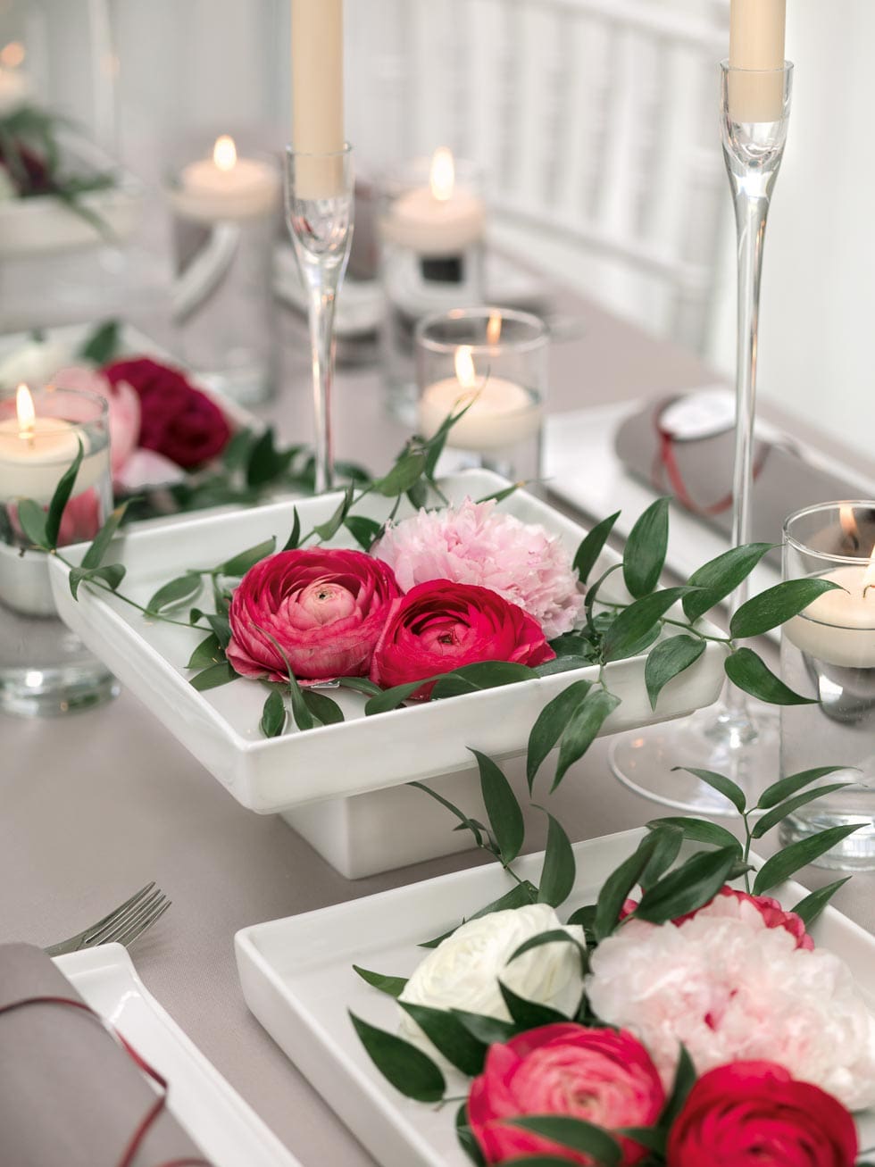 - Jetzt noch ein paar Kerzen in verschiedenen Höhen dazu stellen und fertig ist eure atemberaubende Pfingstrosen-Tischdeko.