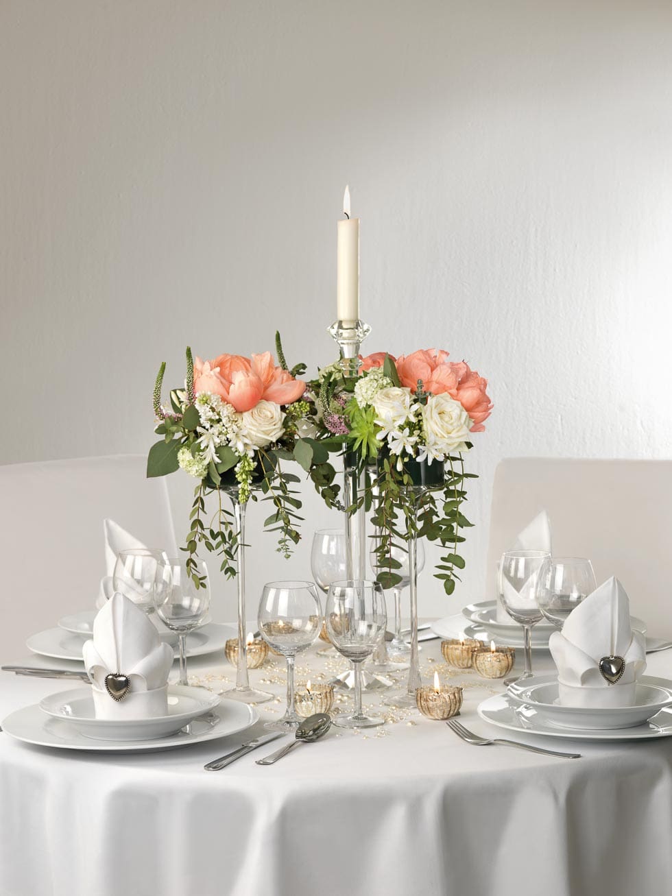 Glas-Kerzenhalter für Schwimmkerzen dienen bei dieser Tischdeko als Vase, die mit Steckschaum bestückt wurde. Die herabhängenden Floralien verdecken die Steckmasse und bilden ein tolles Podest für eine große lachsfarbene Pfingstrose.