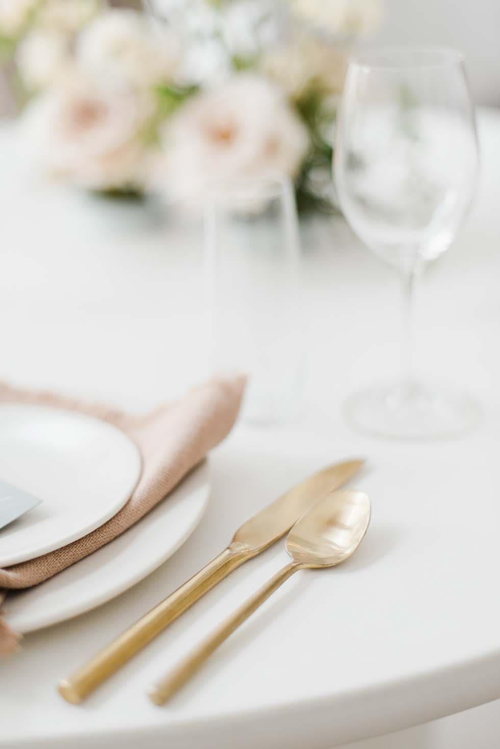 Kombiniert die Gestecke mit wunderschönen Leinenservietten* und puristischen Stabkerzenhaltern in Gold* sowie nudefarbenen Kerzen*.