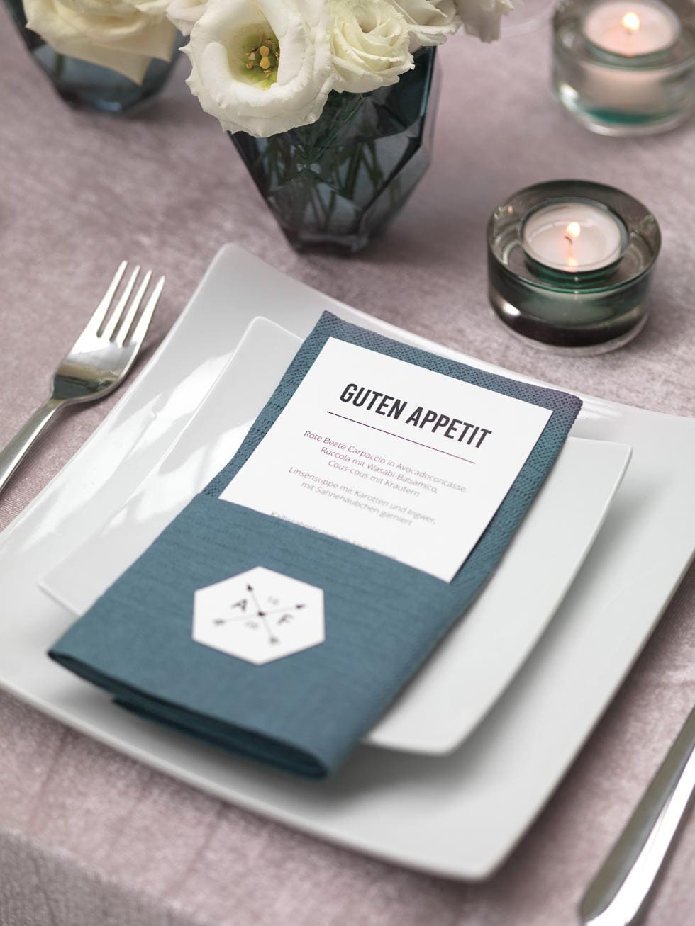 Damit die Fläche jedoch trotzdem nicht zu dunkel und intensiv wirkt, haben wir eine unserer Hochzeitslogo-Vorlagen in Hexagon-Form ausgestanzt und als Schildchen auf die Serviette gelegt. So erhaltet ihr zusätzlich einen persönlichen Touch.