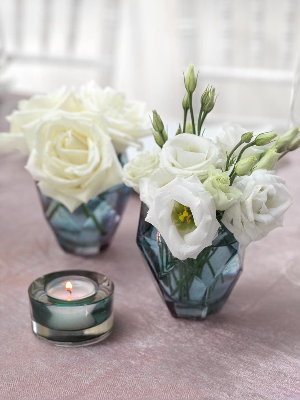 In unserem Beispiel sorgen türkisfarbene Vasen in geometrischer Form für einen modernen Look. Kombiniert mit zarten Blüten in Beige entsteht ein spannender Kontrast und ein harmonisches Gesamtbild.