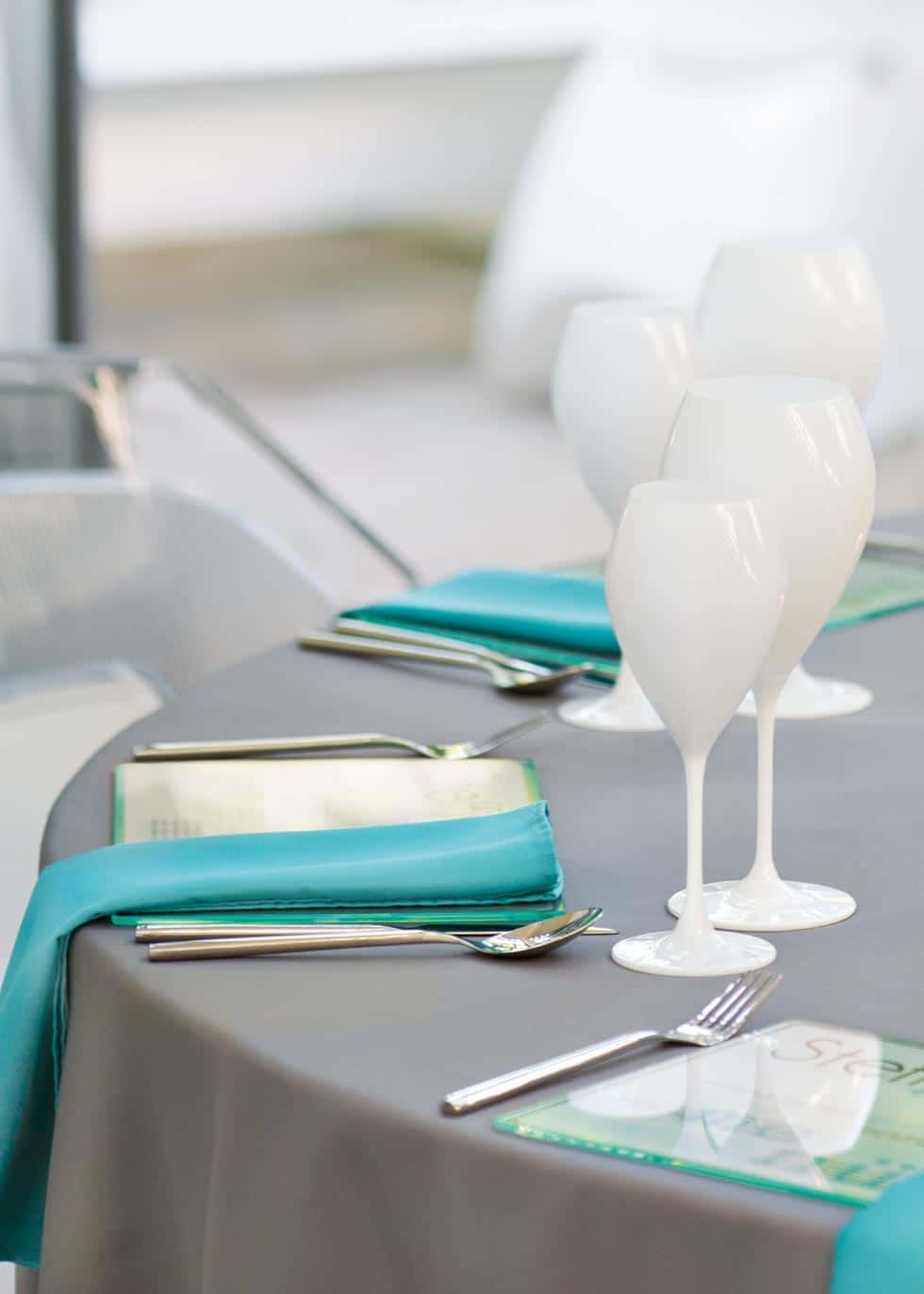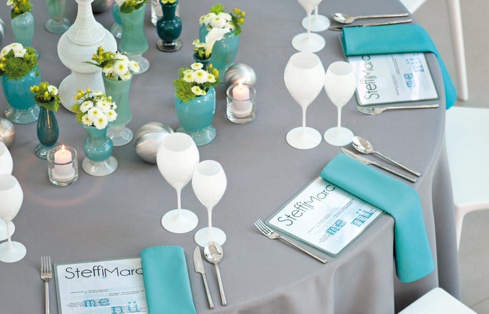 Auch die kleinsten Details greifen die Farbwelt auf: Türkisfarbene Servietten, passende Menükarten unter Glas und silberne Kugeln auf der granitfarbenen Tischdecke vereinen sich zu einem stimmigen Gesamtbild.