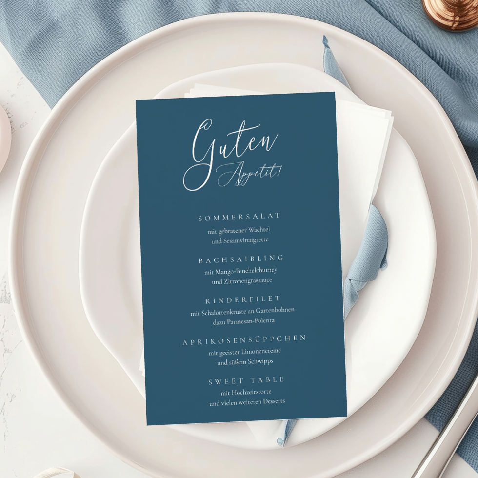 Die Menükarte wird hier stilvoll von einer weichen Serviette in passendem Türkis umhüllt – optisch ein Highlight, das gleichzeitig funktional ist.