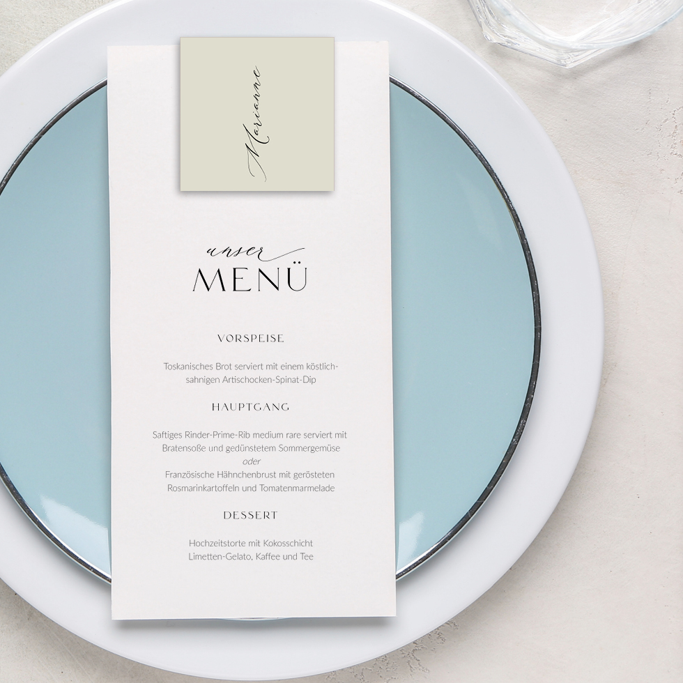 DIY-Tipp: Falte die Serviette zur Bestecktasche und platziere die Menükarte darin. → Anleitung ansehen