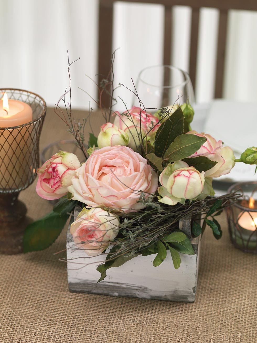 Verwendet Blumen mit romantischem Charme wie Rosen, Hortensien, Pfingstrosen oder Wiesenblumen und setzt sie in Flaschen, Kristallvasen, Teetassen oder antiken Glasbehältern in Szene.